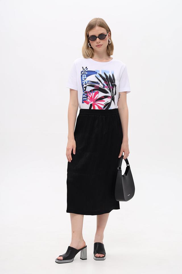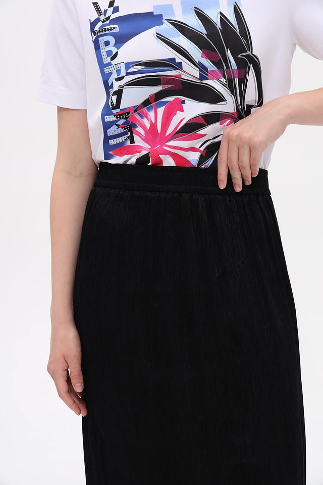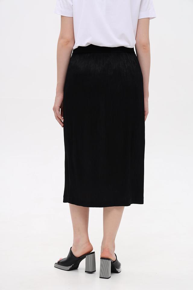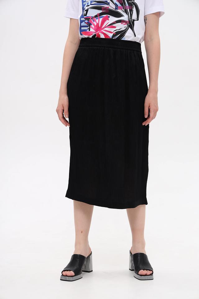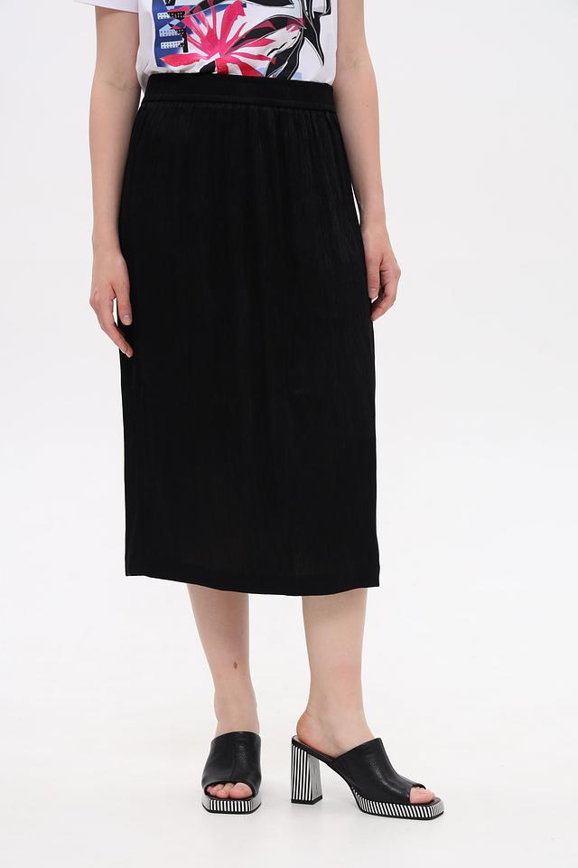 Модель имеет миди-длину и прямой крой, что обеспечивает комфортную посадку по фигуре. Эластичный пояс гарантирует удобство в носке и позволяет юбке идеально сидеть на талии.