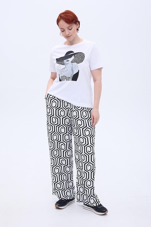 Основной цвет брюк – белый, украшен эффектным чёрным геометрическим принтом. Такой рисунок придаёт изделию современный и динамичный вид. Брюки изготовлены из высококачественной 100% вискозы, которая приятна к телу, хорошо драпируется и обеспечивает отличную воздухопроницаемость.