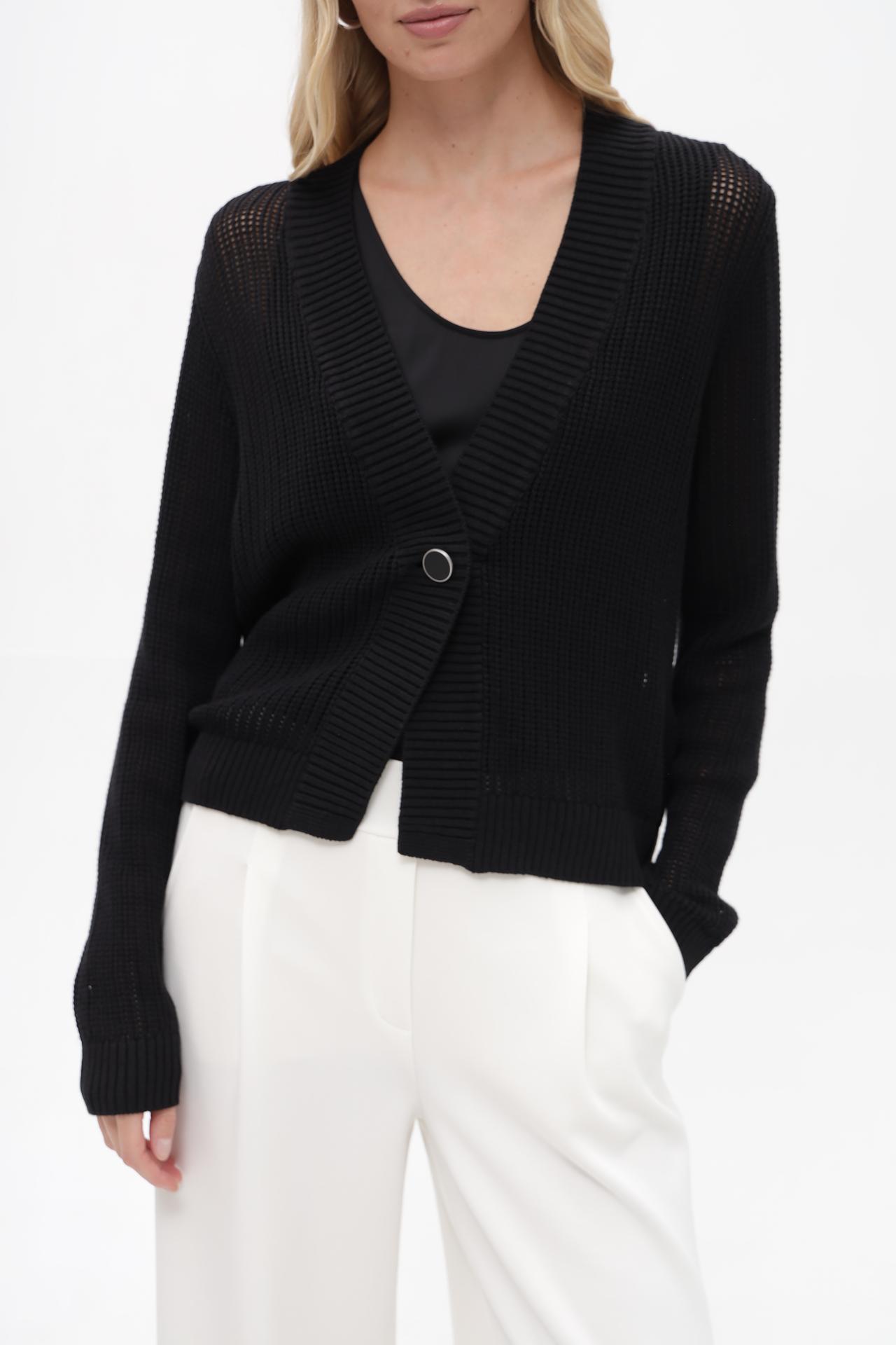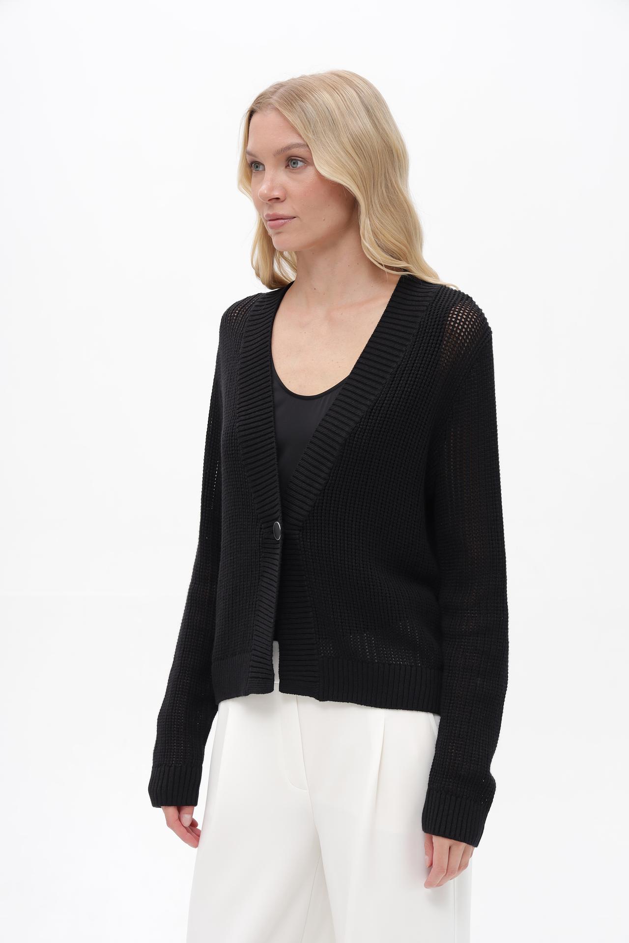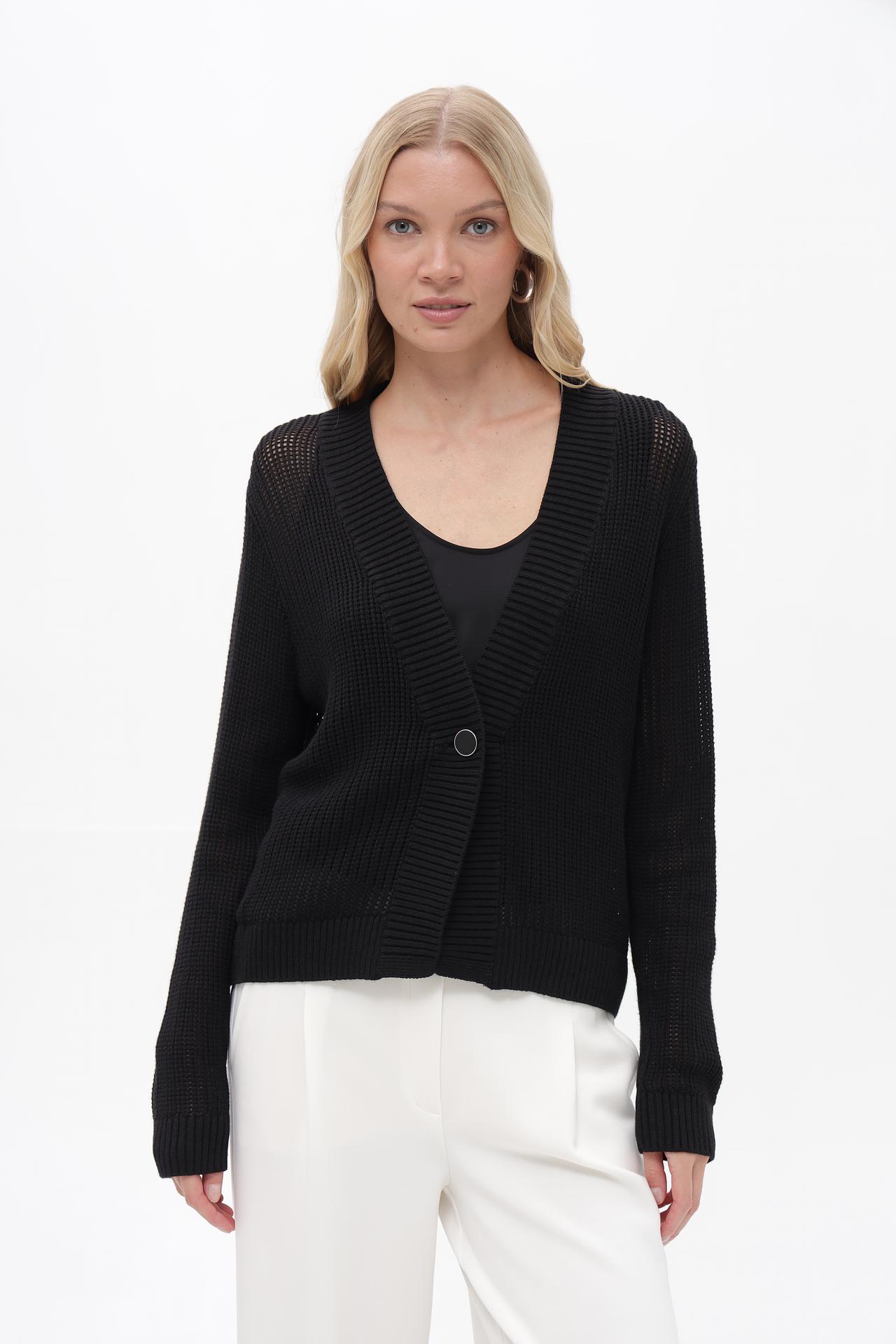 - Детали: V-образный вырез и одна пуговица спереди добавляют изделию элегантности.