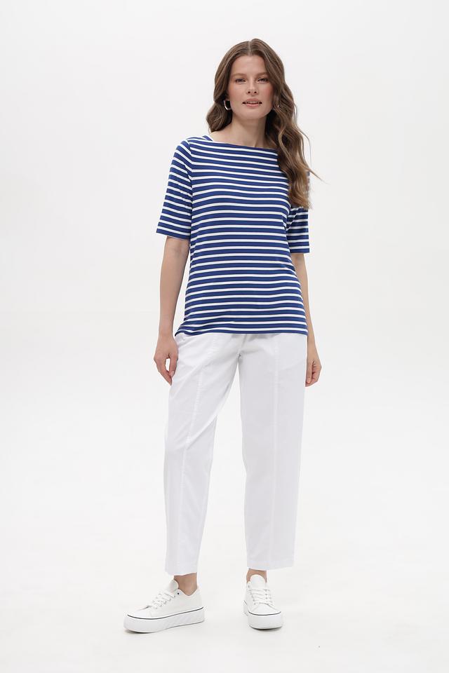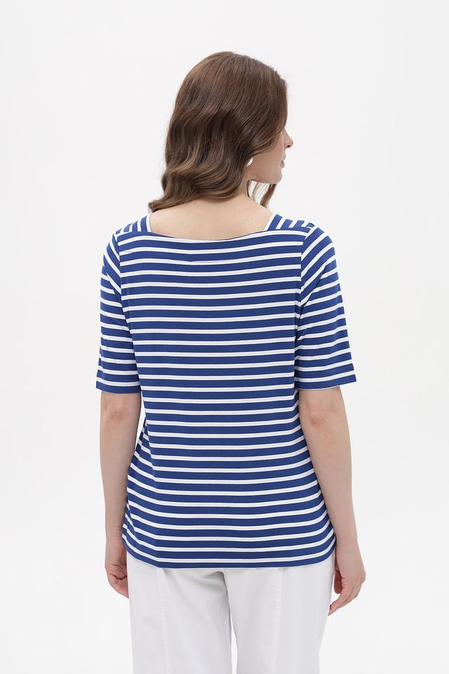 Женская футболка Gerry Weber синего цвета с классическими белыми полосами. Модель выполнена из мягкой вискозы с добавлением эластана, обеспечивающей комфорт в носке и хорошую посадку по фигуре. Состав: вискоза 95%, эластан 5%