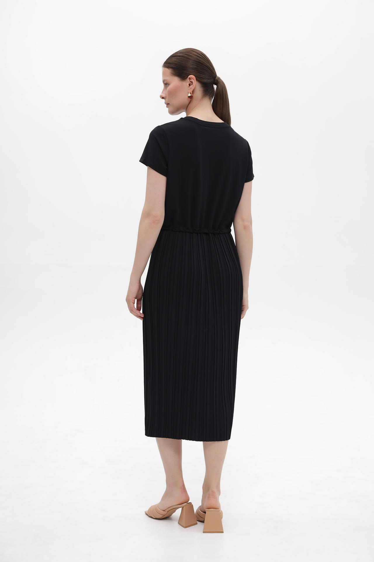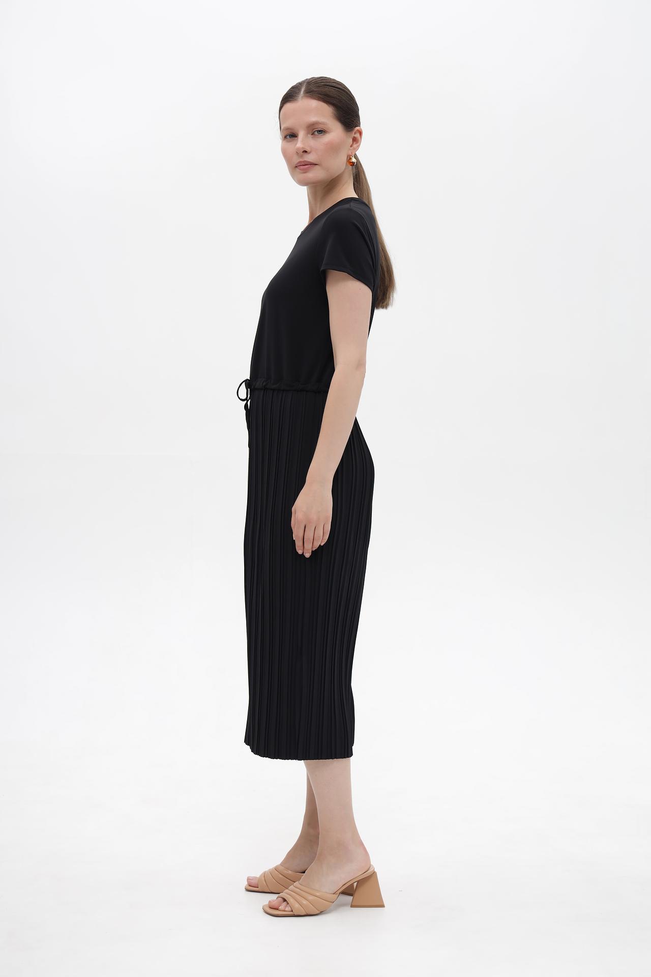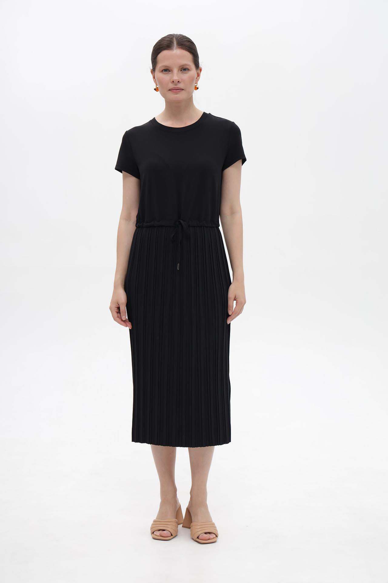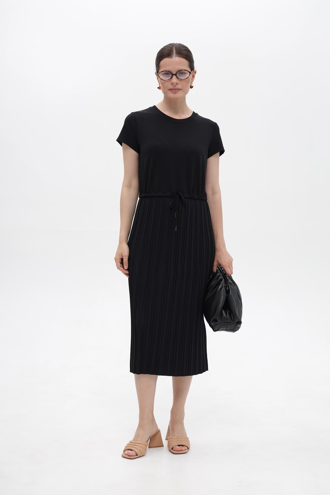 - Дизайн: Платье выполнено в классическом чёрном цвете. Верхняя часть имеет короткие рукава и круглый вырез, а нижняя – эффектное плиссированное исполнение. Приталенный силуэт подчёркивается кулиской на талии, позволяющей регулировать посадку.