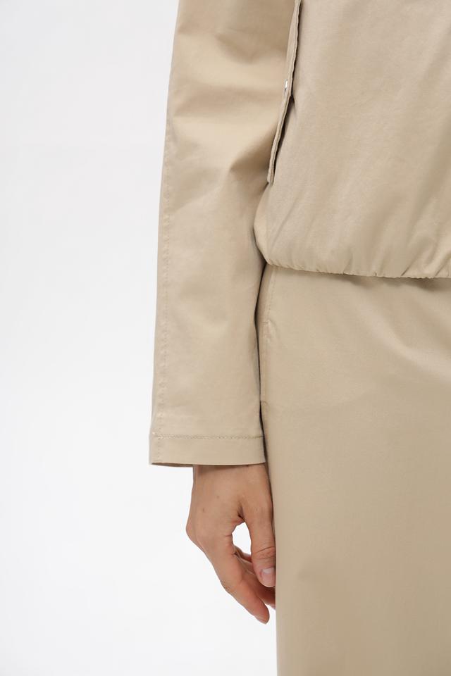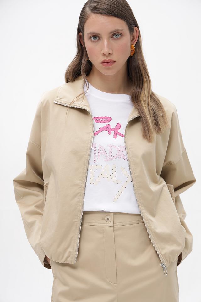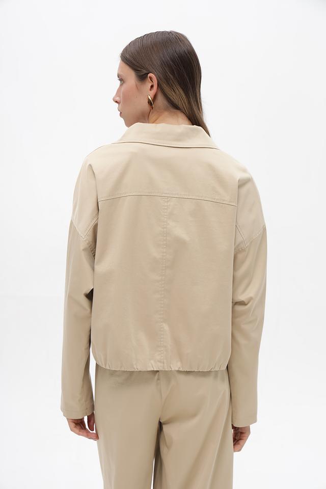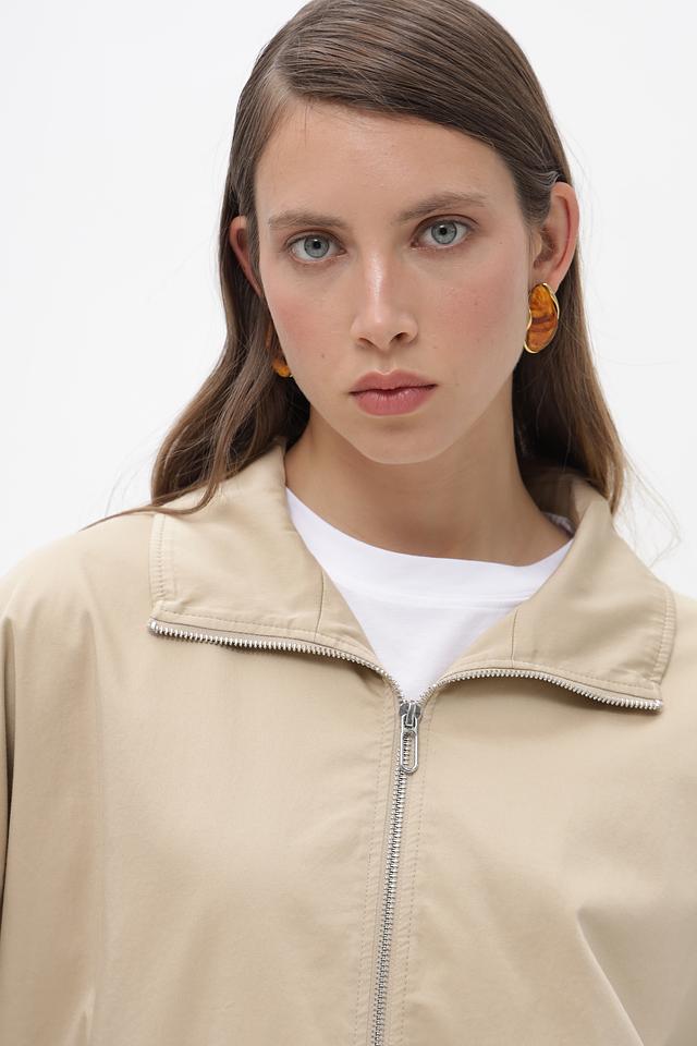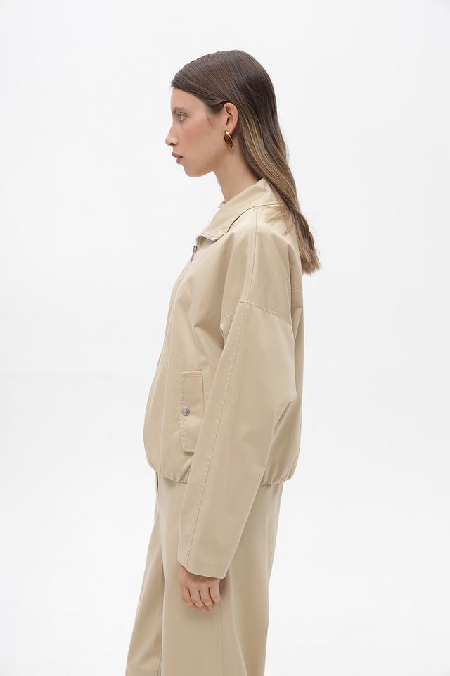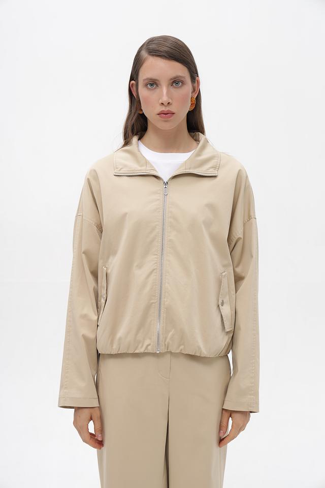 Жакет имеет свободный крой, воротник-стойку и застегивается на молнию. Наличие боковых карманов добавляет функциональности. Рукава реглан обеспечивают свободу движений.