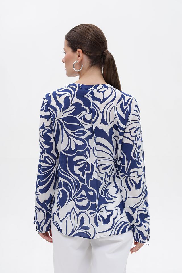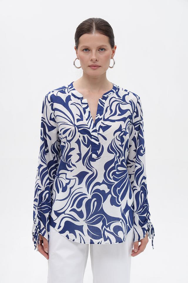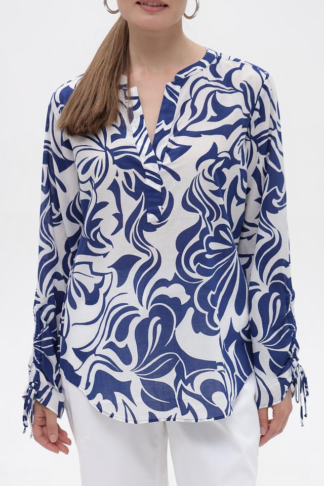 Особенность модели – яркий и запоминающийся цветочный принт в сине-белой гамме, который придает блузке особую изысканность. Свободный крой обеспечивает свободу движений и комфортную посадку по фигуре.