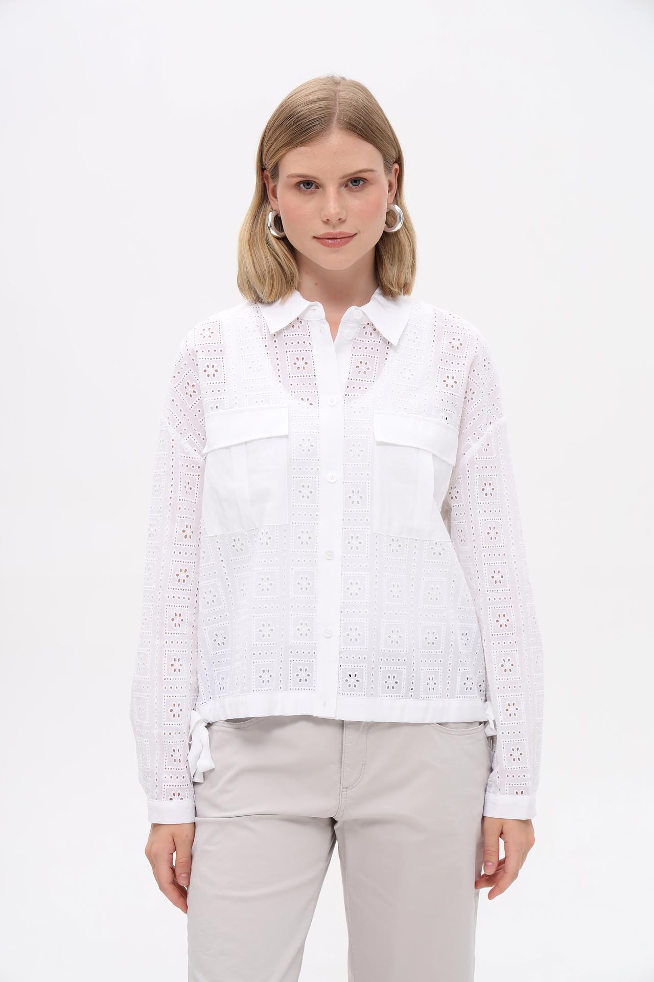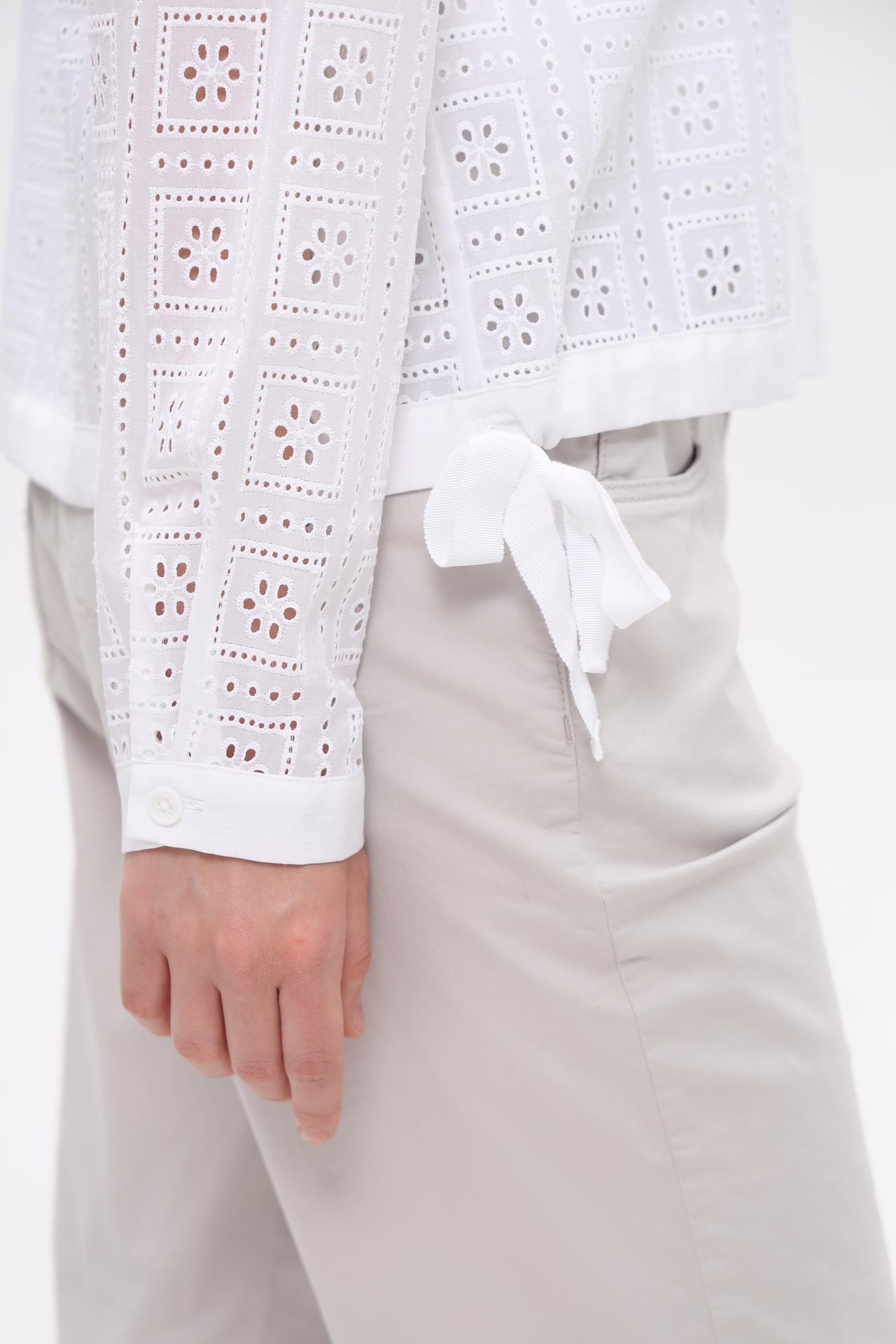 - Декоративная перфорация. Изысканный ажурный узор придает блузе женственность и оригинальность.