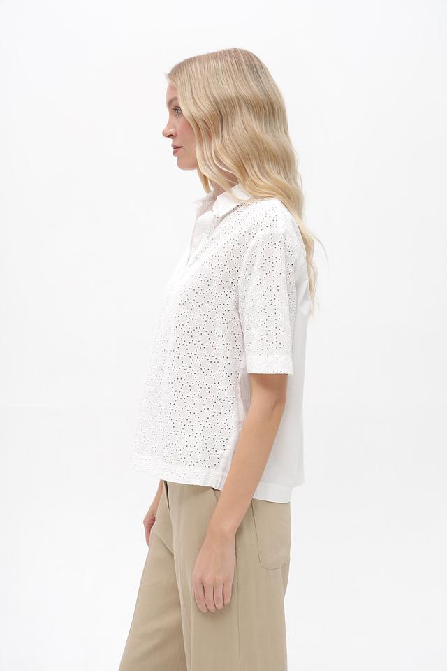 Блузка имеет свободный крой, короткие рукава и воротник-стойку с V-образным вырезом. Особенностью модели является ажурная вышивка, придающая ей лёгкость и изысканность.