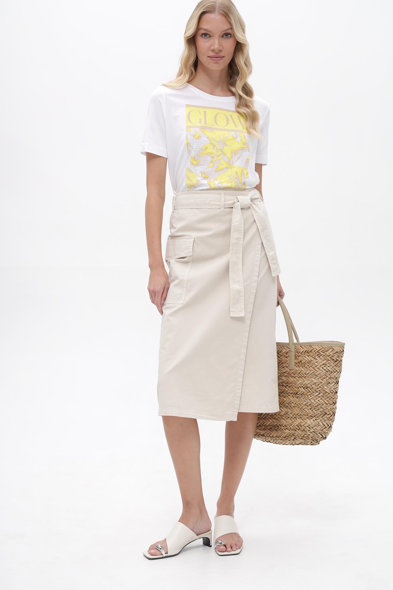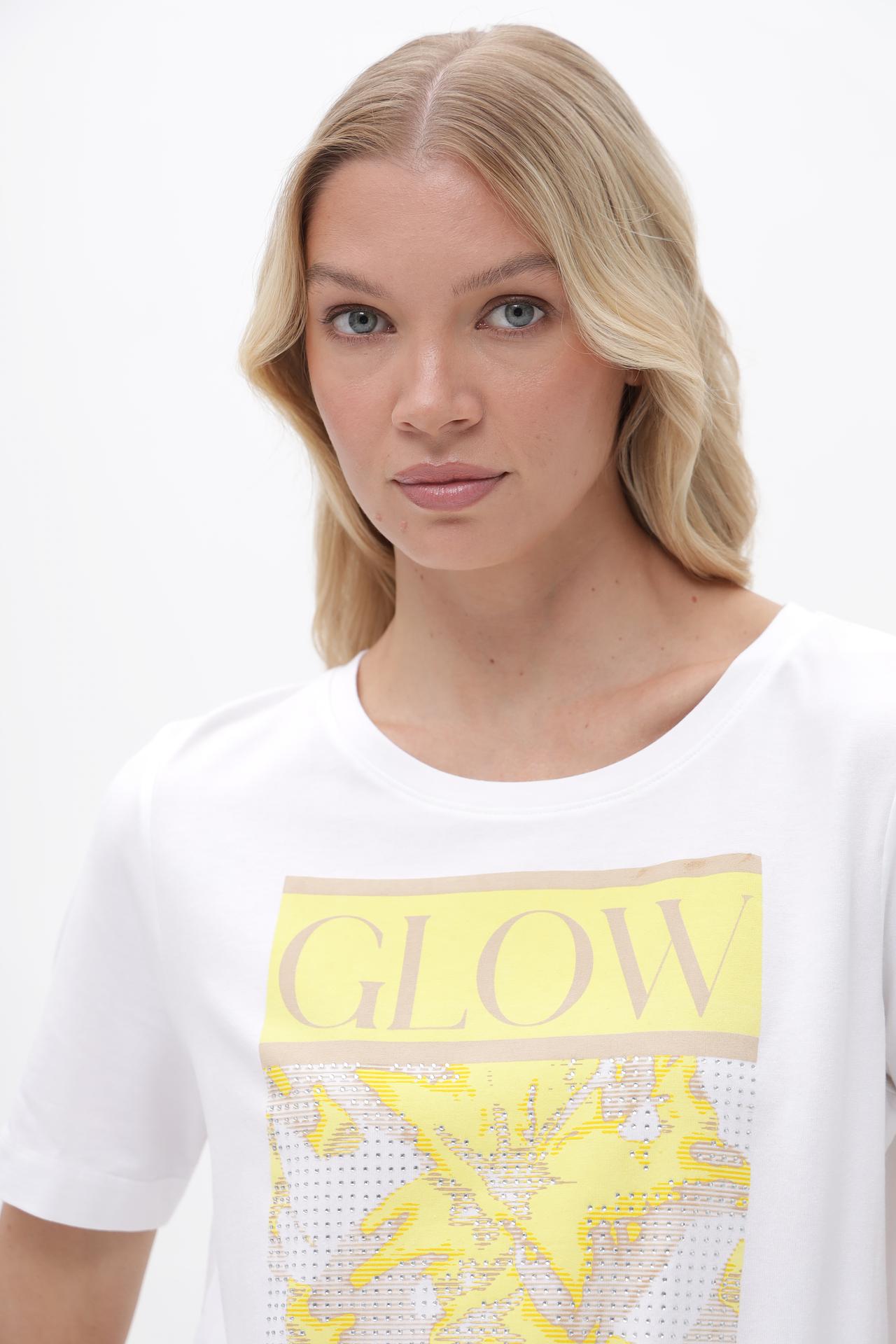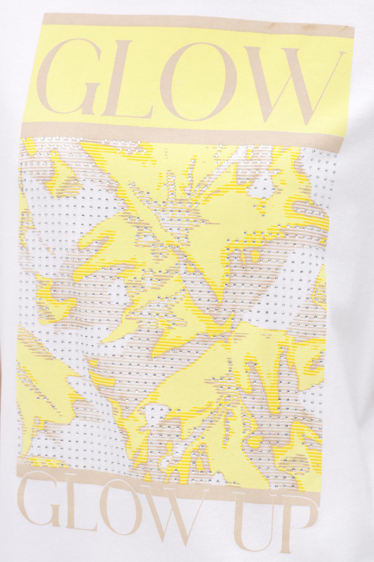 - Яркий графический принт. Центральное украшение футболки – выразительный принт с надписью "Glow Up" и абстрактными элементами, дополненный мерцающими акцентами. Этот стильный дизайн придает изделию современный и динамичный вид, выделяя его из множества базовых моделей.