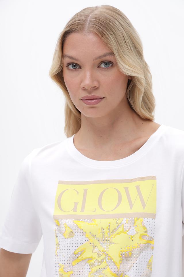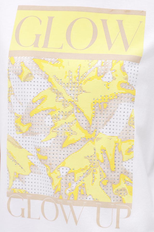 Основным элементом дизайна является яркий принт с надписями “GLOW” и “GLOW UP” на фоне стилизованного изображения. Футболка имеет классический крой с короткими рукавами и круглым вырезом горловины. Она легко сочетается с различными предметами гардероба, такими как джинсы, юбки или шорты.