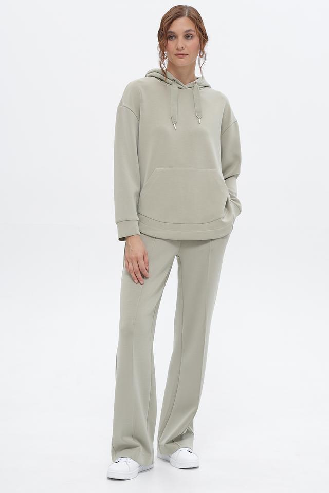 Брюки имеют завышенную талию и широкие штанины, что создает элегантный и современный силуэт. Удобный пояс на резинке обеспечивает комфортную посадку по фигуре.