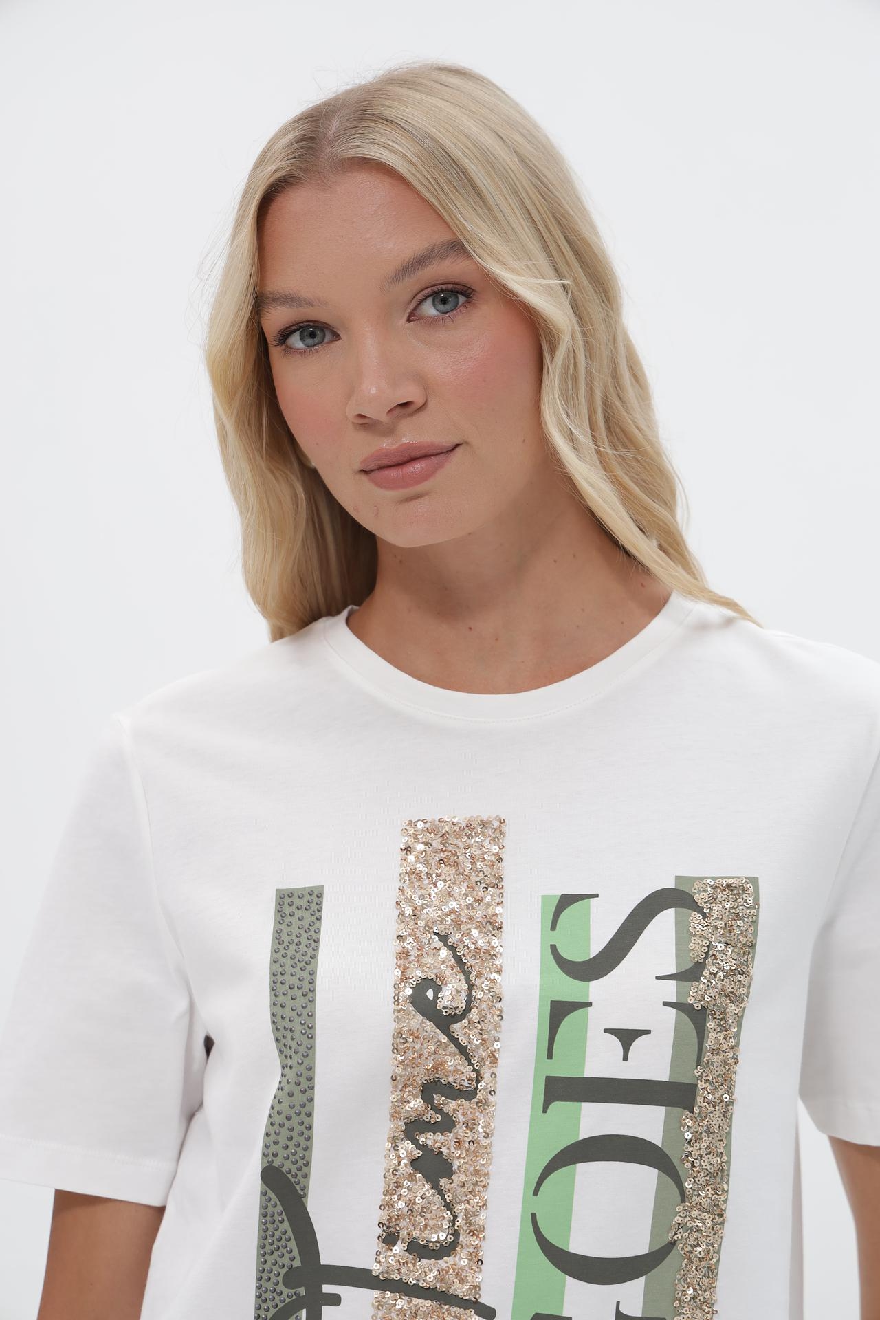 - Дизайн: Футболка декорирована эффектным принтом с пайетками, который добавляет образу яркости и индивидуальности.