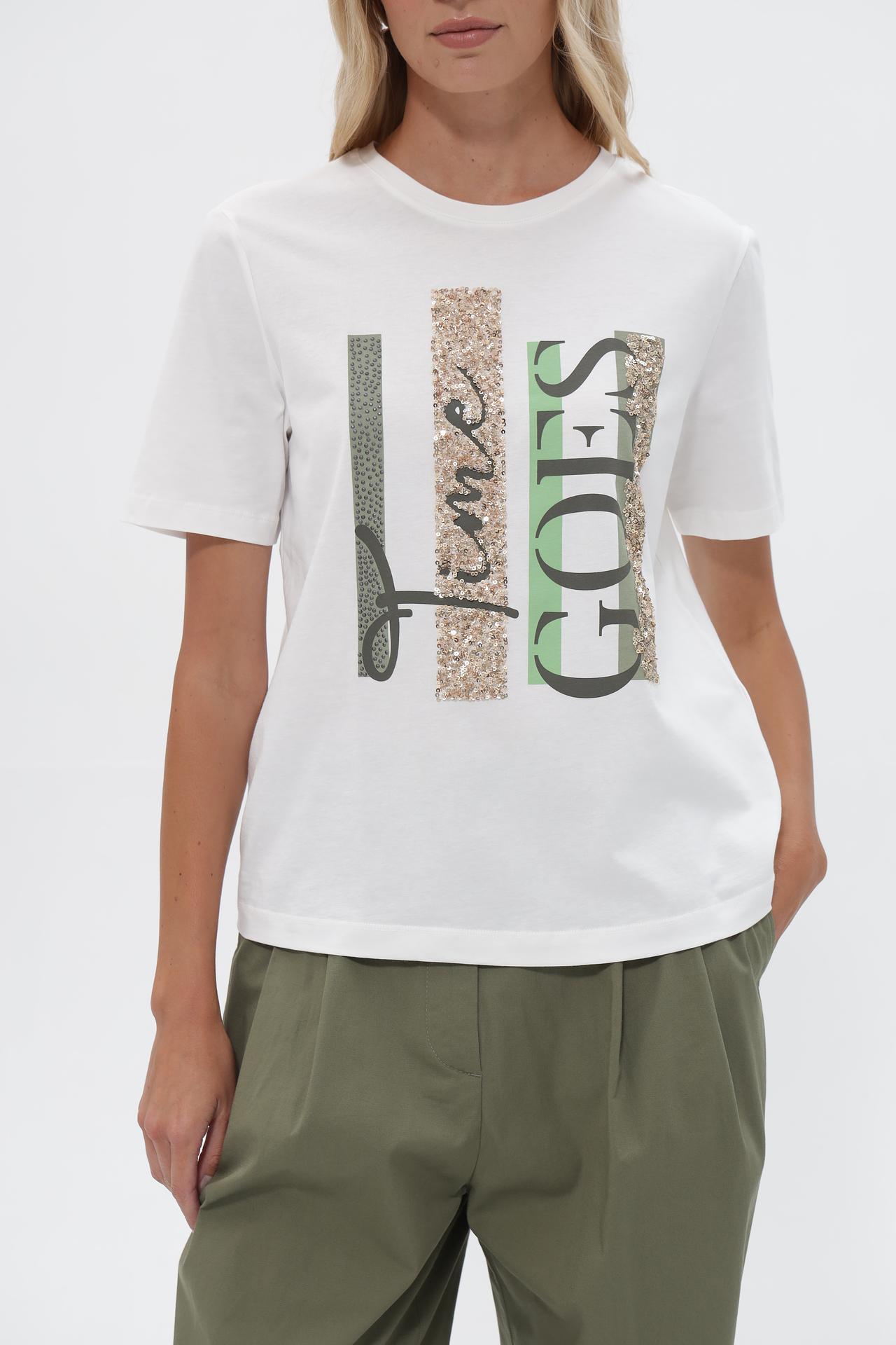 Оригинальный принт с использованием пайеток и различных текстур придает футболке особую изысканность и делает ее акцентным элементом любого образа. Такая футболка прекрасно сочетается как с джинсами и шортами для создания повседневных луков, так и с юбками или брюками для более элегантных ансамблей. Это универсальный предмет гардероба, который добавит изюминку в ваш стиль.
