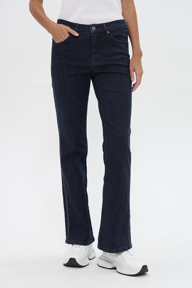 Джинсы имеют прямую посадку по фигуре и стандартную высоту талии, что обеспечивает комфорт в носке. Декоративные швы с вышивкой вдоль штанин добавляют образу изысканности.