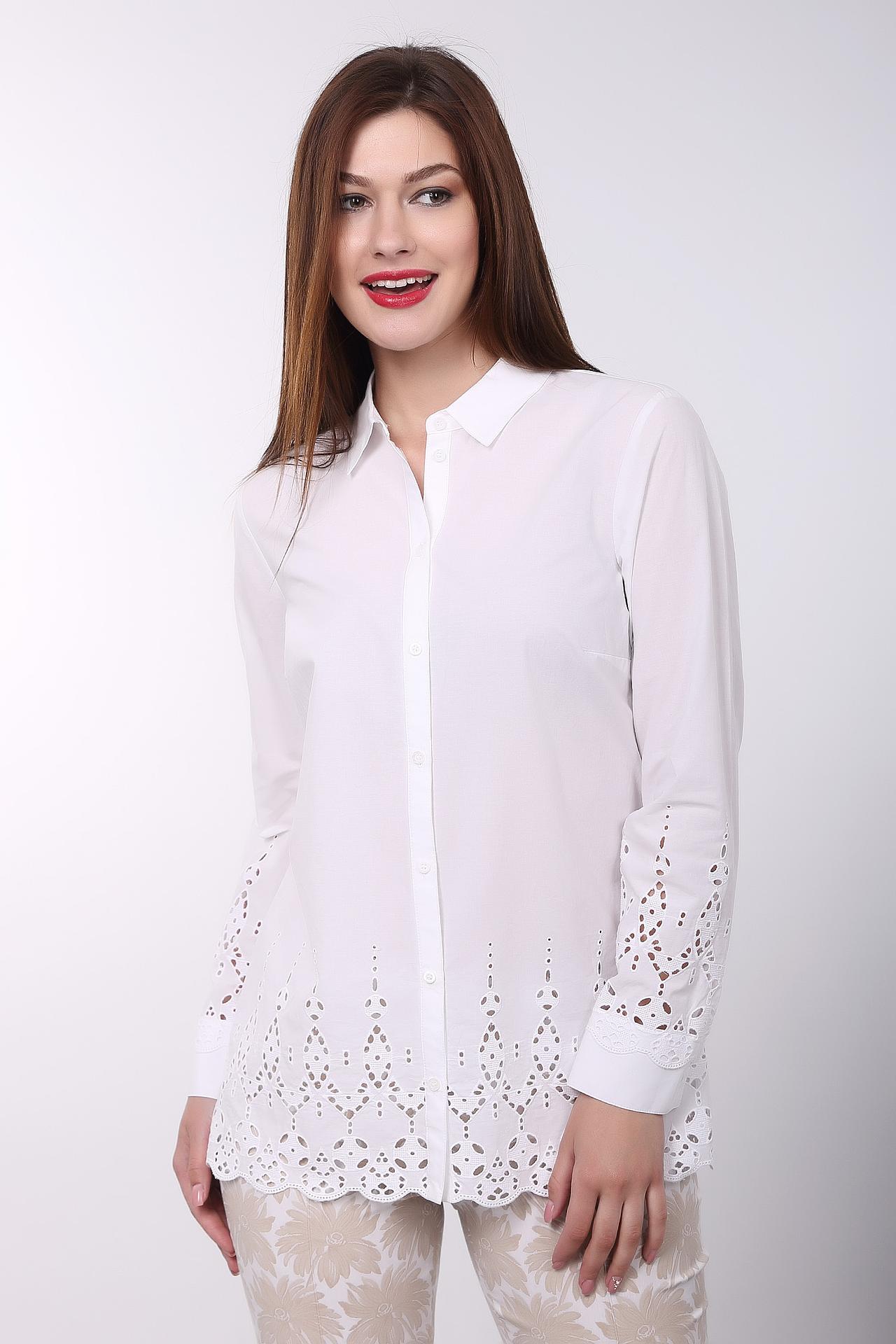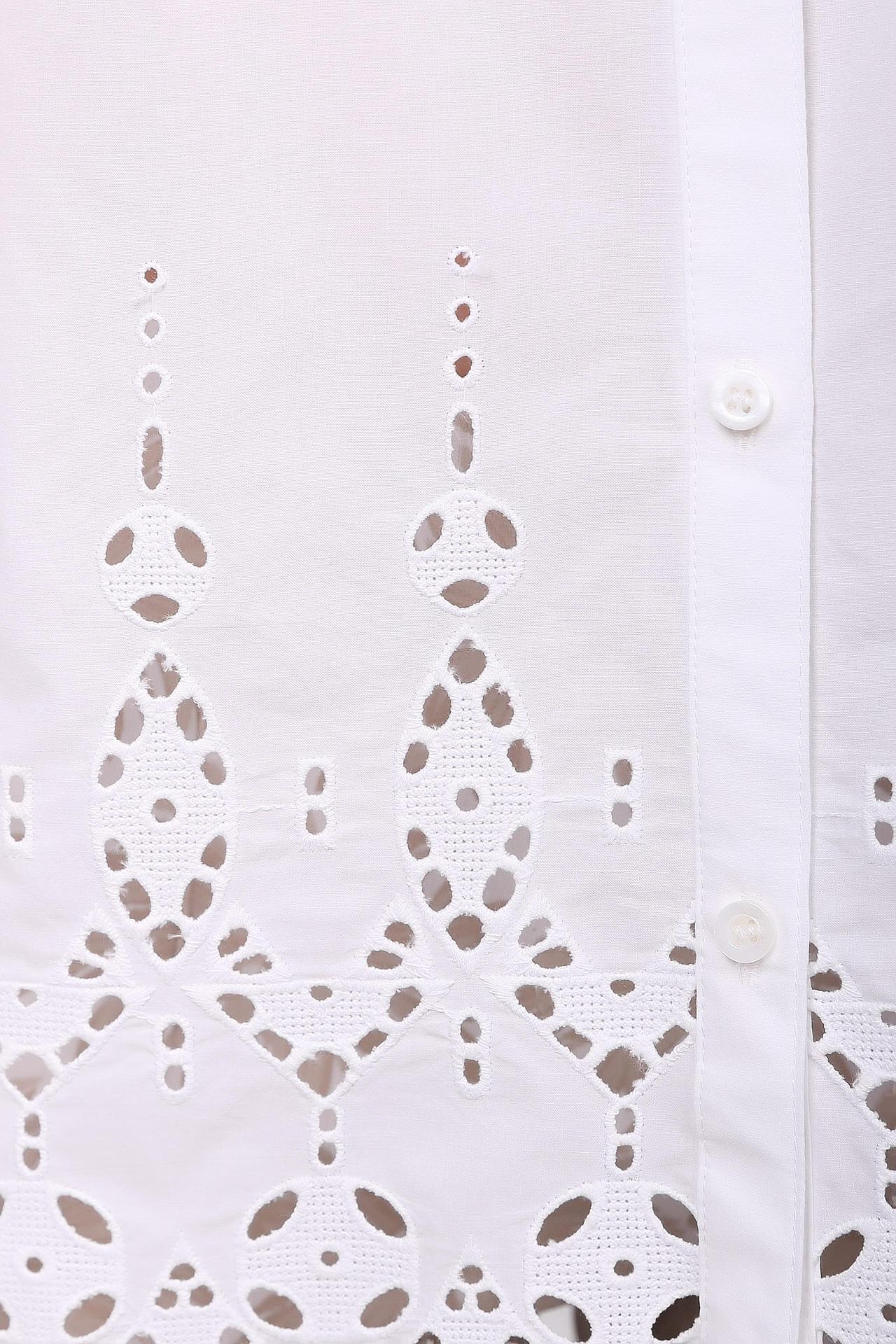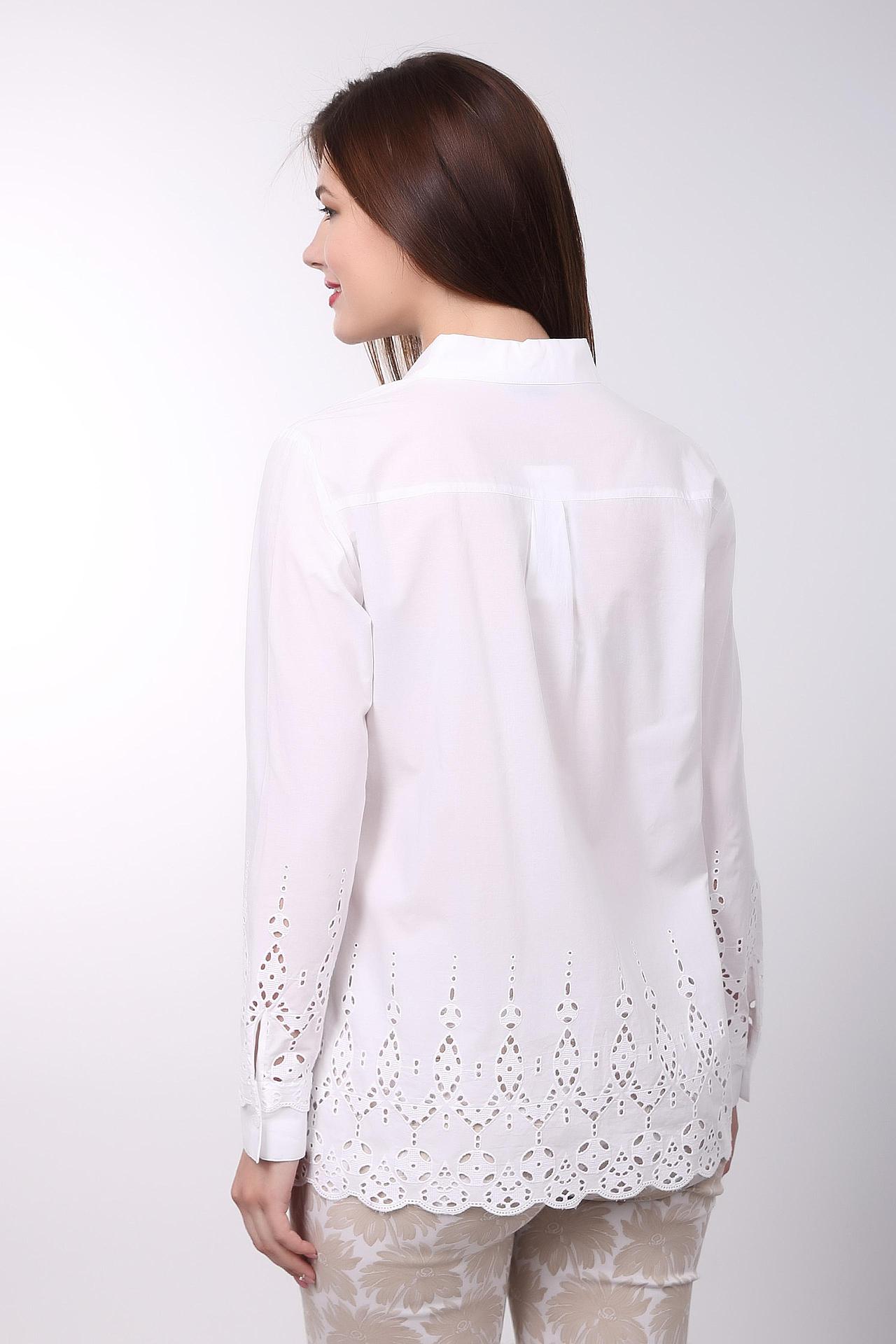 Блуза белого цвета фирмы Gerry Weber. Ткань состоит из 100% хлопка. Модель выполнена прямым покроем. Блуза дополнена откладным воротом на стойке, застежка на пуговицы, длинным, втачным рукавом с манжетой на пуговицу, задней кокеткой.. Модель декорирована узором. Комфортная посадка по фигуре.