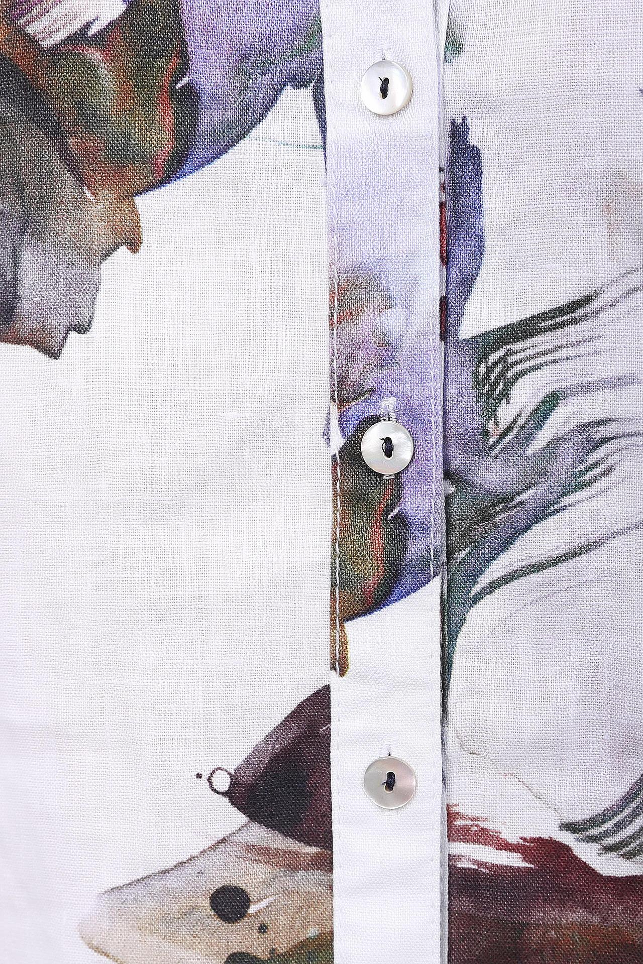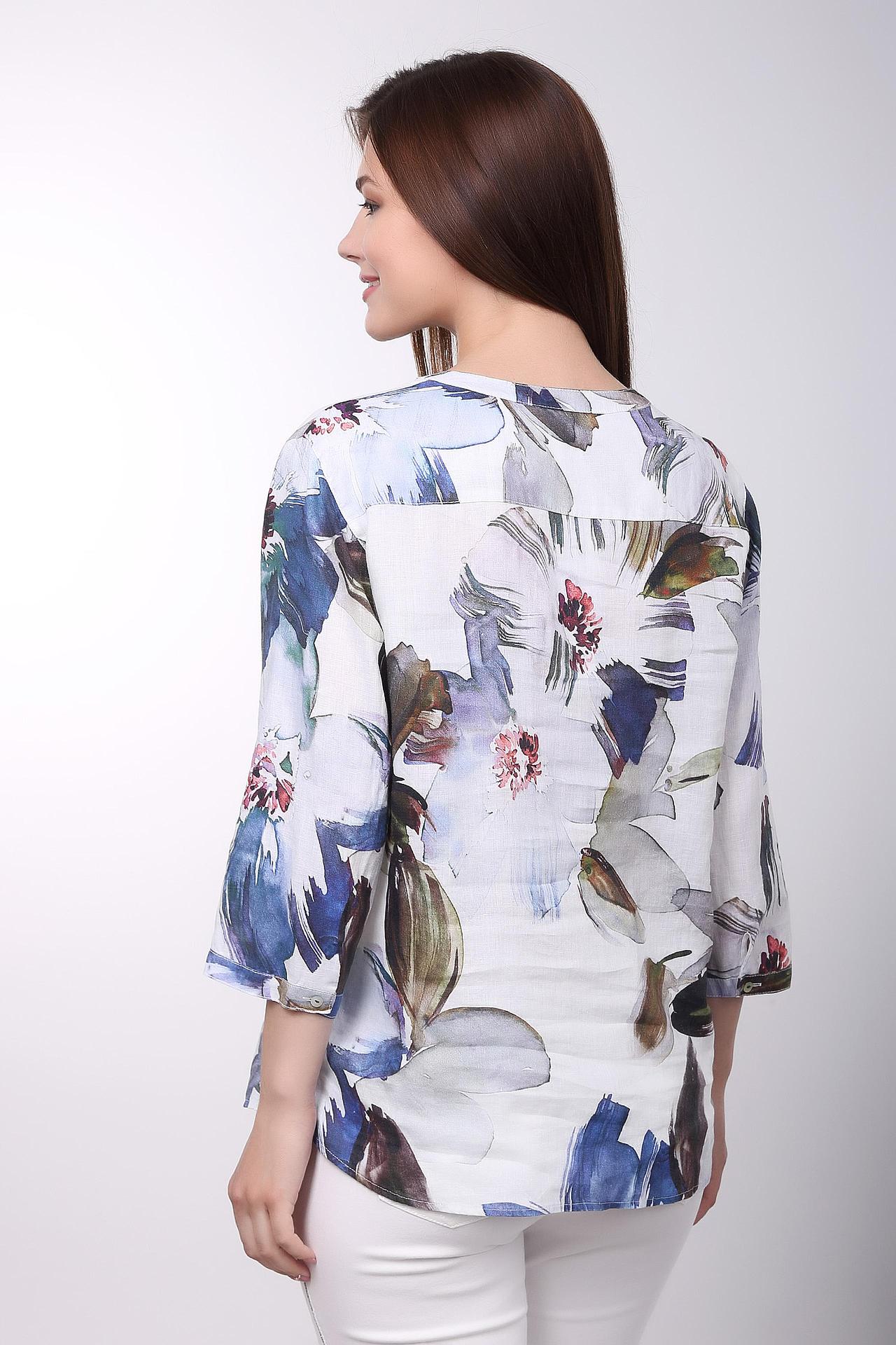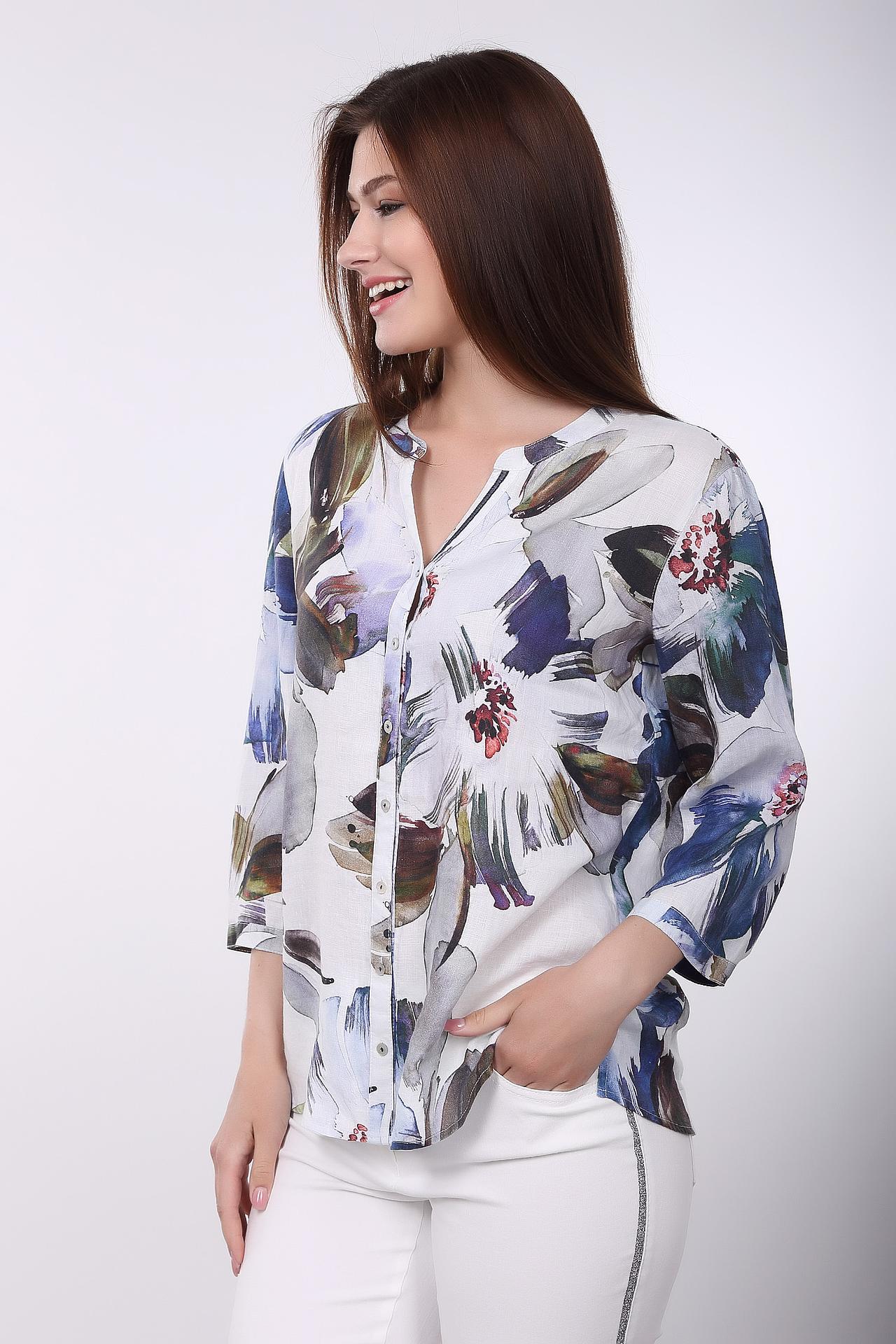 Яркий цветочный принт на белом фоне придает изделию свежий и выразительный вид, делая блузу центральным элементом любого образа. Универсальный крой с длиной до бедер и слегка спущенной линией плеча подходит для различных типов фигур.