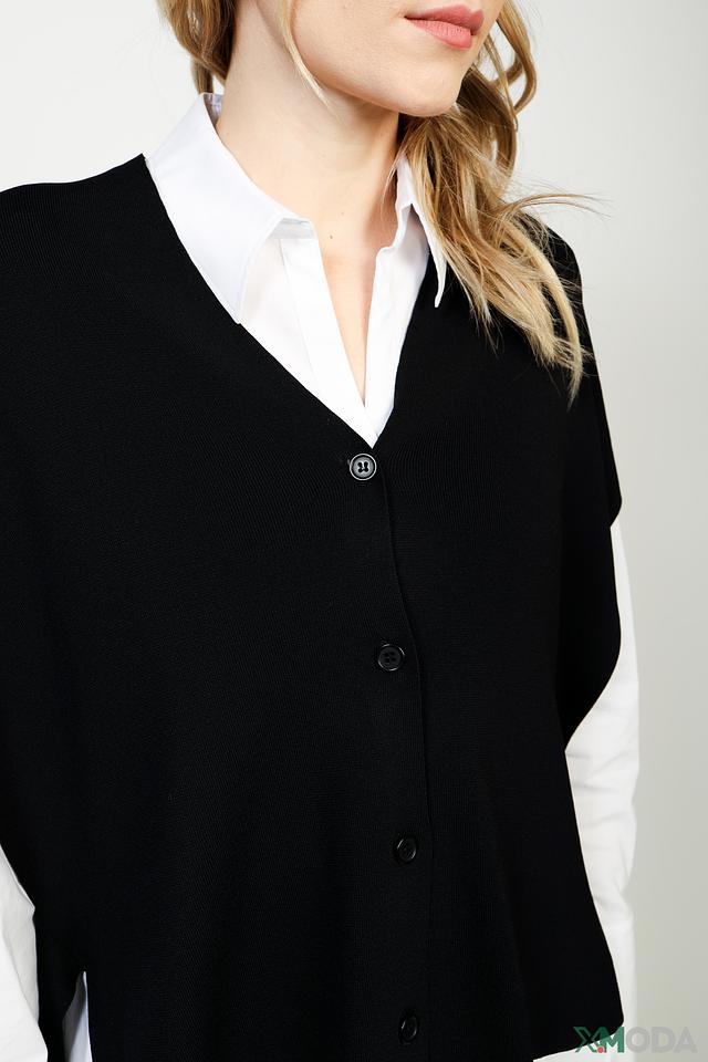 Жилет имеет V-образный вырез и застёжку на пуговицы, что придает ему изысканный вид. Асимметричный подол с боковой лентой добавляет оригинальности и динамики. Модель выполнена из высококачественного трикотажа, в составе которого 67% вискозы и 33% полиамида. Вискоза обеспечивает мягкость и комфорт, а полиамид – долговечность и устойчивость к деформации.