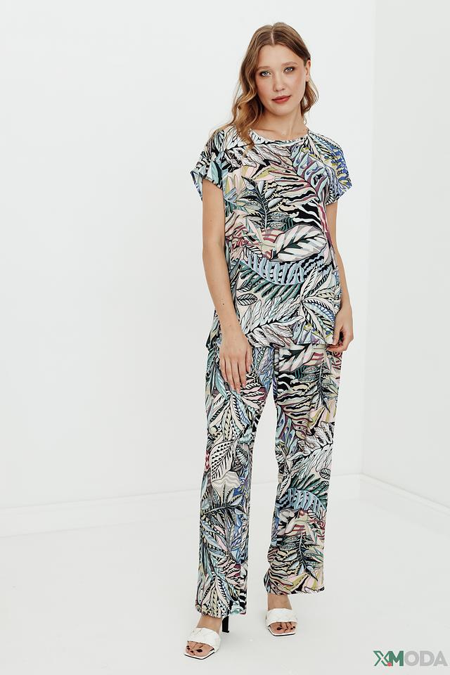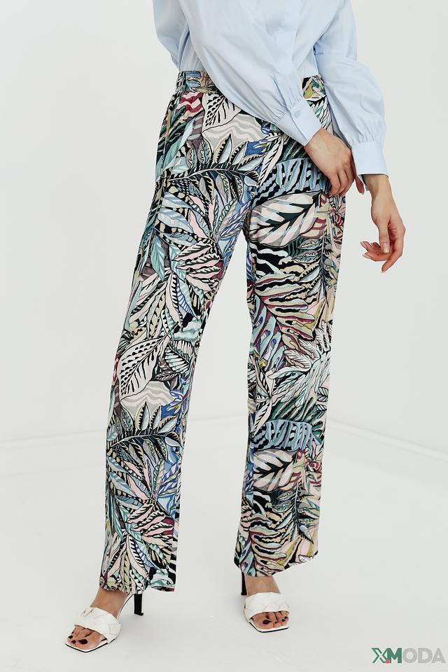 Брюки отличаются широким кроем и высокой посадкой, что обеспечивает свободу движений и подчеркивает талию. Главная особенность – эффектный принт с изображением тропических листьев в разнообразных оттенках: зеленого, синего, розового и бежевого.