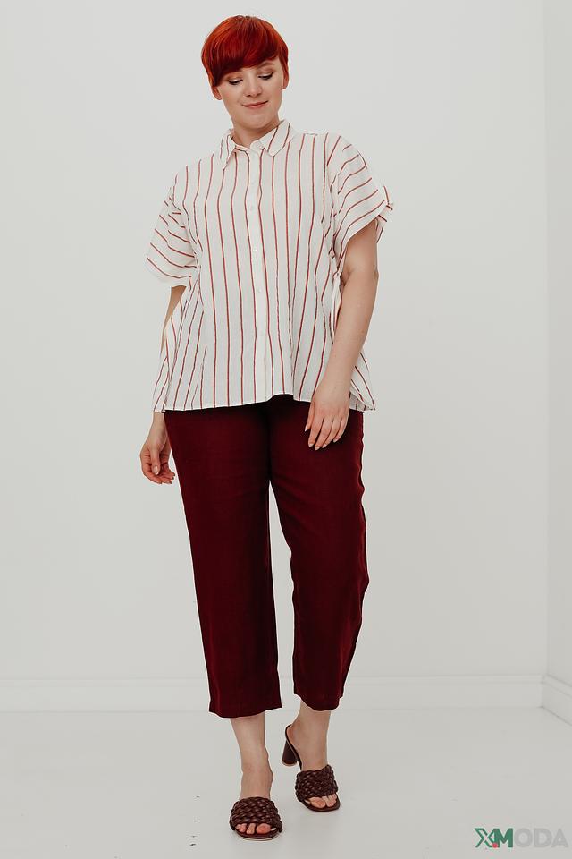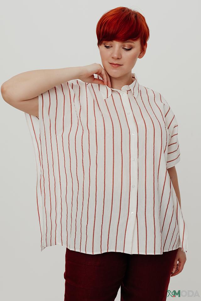 Рубашка имеет прямой крой, короткий рукав и классический воротник. Вертикальная полоска белого и терракотового цвета визуально вытягивает силуэт и добавляет образу динамичности. Застёжка на пуговицы по всей длине позволяет регулировать степень прилегания.