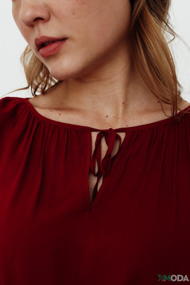 Блуза имеет свободный крой, который не сковывает движений и позволяет создать расслабленный силуэт. V-образный вырез горловины украшен небольшим декоративным элементом в виде завязок, добавляющим образу игривости. Короткие рукава слегка спущены, что придает блузе современный вид.