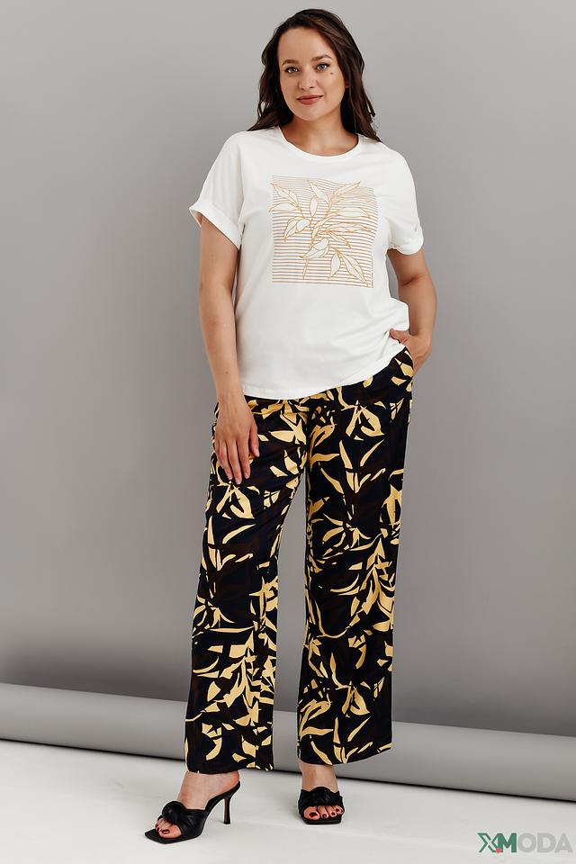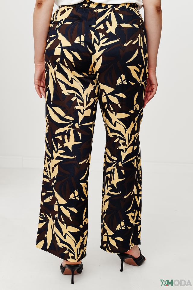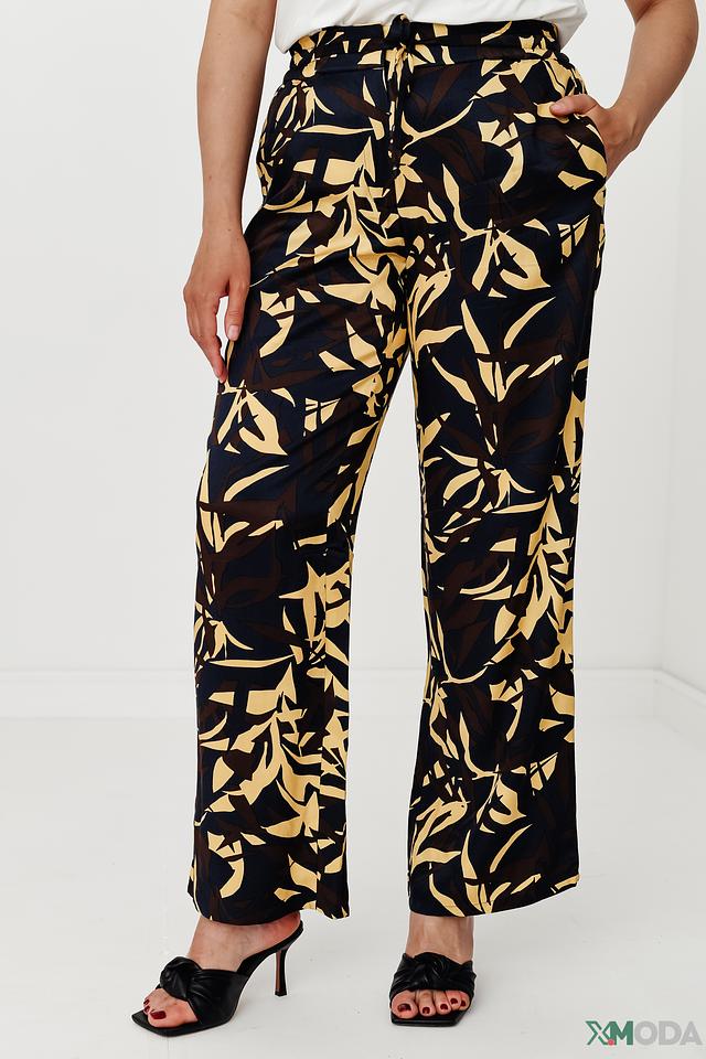 Особенностью модели является яркий цветочный принт, сочетающий в себе оттенки черного, желтого и коричневого. Прямой крой и классическая посадка делают брюки универсальными и подходящими для различных типов фигуры.