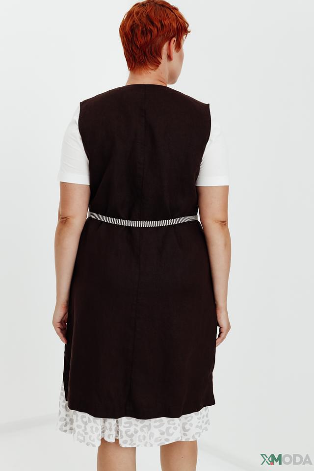 В комплекте с жилетом идёт пояс с черно-белым узором, который позволяет акцентировать талию и создать более женственный силуэт. Жилет можно носить как самостоятельный элемент одежды, так и в сочетании с другими вещами, например, с рубашкой, футболкой или платьем.