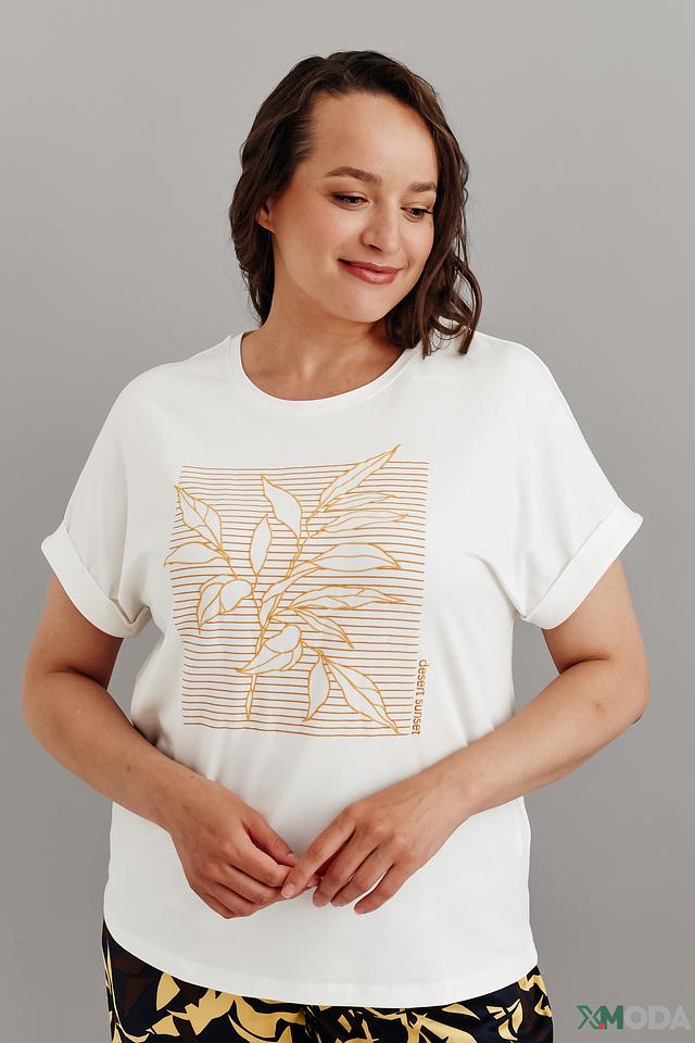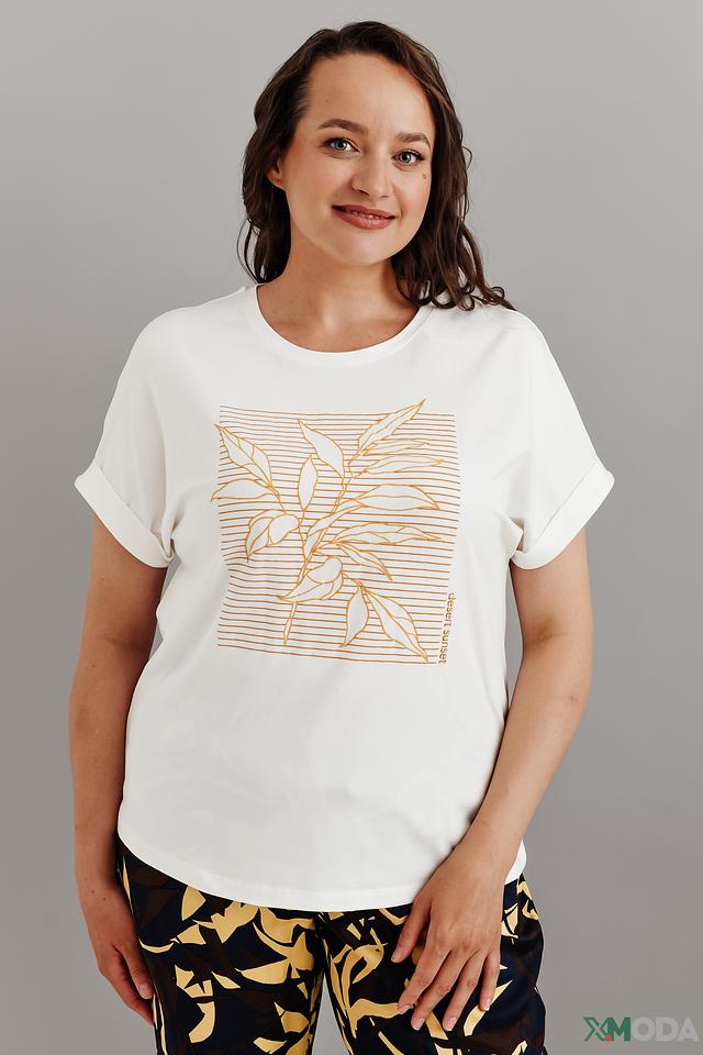 Белая футболка Gerry Weber с оригинальным золотистым принтом в виде листьев. Модель выполнена из мягкого хлопка с модалом и эластаном, обеспечивающим комфорт и свободу движений. Состав: хлопок 47%, модал 47%, эластан 6%