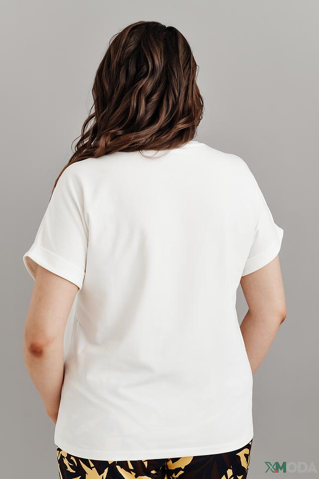 Футболка имеет прямой крой и короткие рукава с манжетами, что придает ей современный и непринужденный вид. Округлый вырез горловины обеспечивает комфортную посадку.