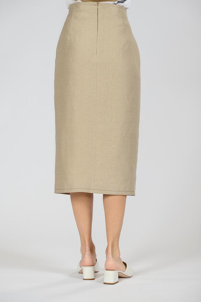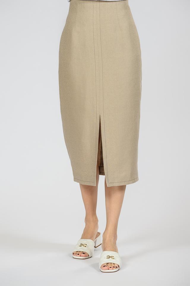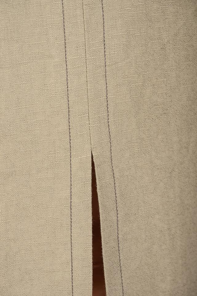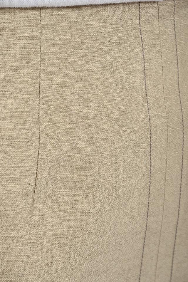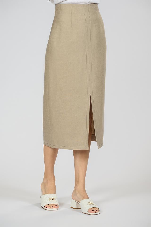 Модель выполнена в бежевом цвете, который легко сочетается с другими элементами гардероба. Спереди юбка имеет разрез, добавляющий образу динамичности и легкости. Застежка – потайная молния сзади.