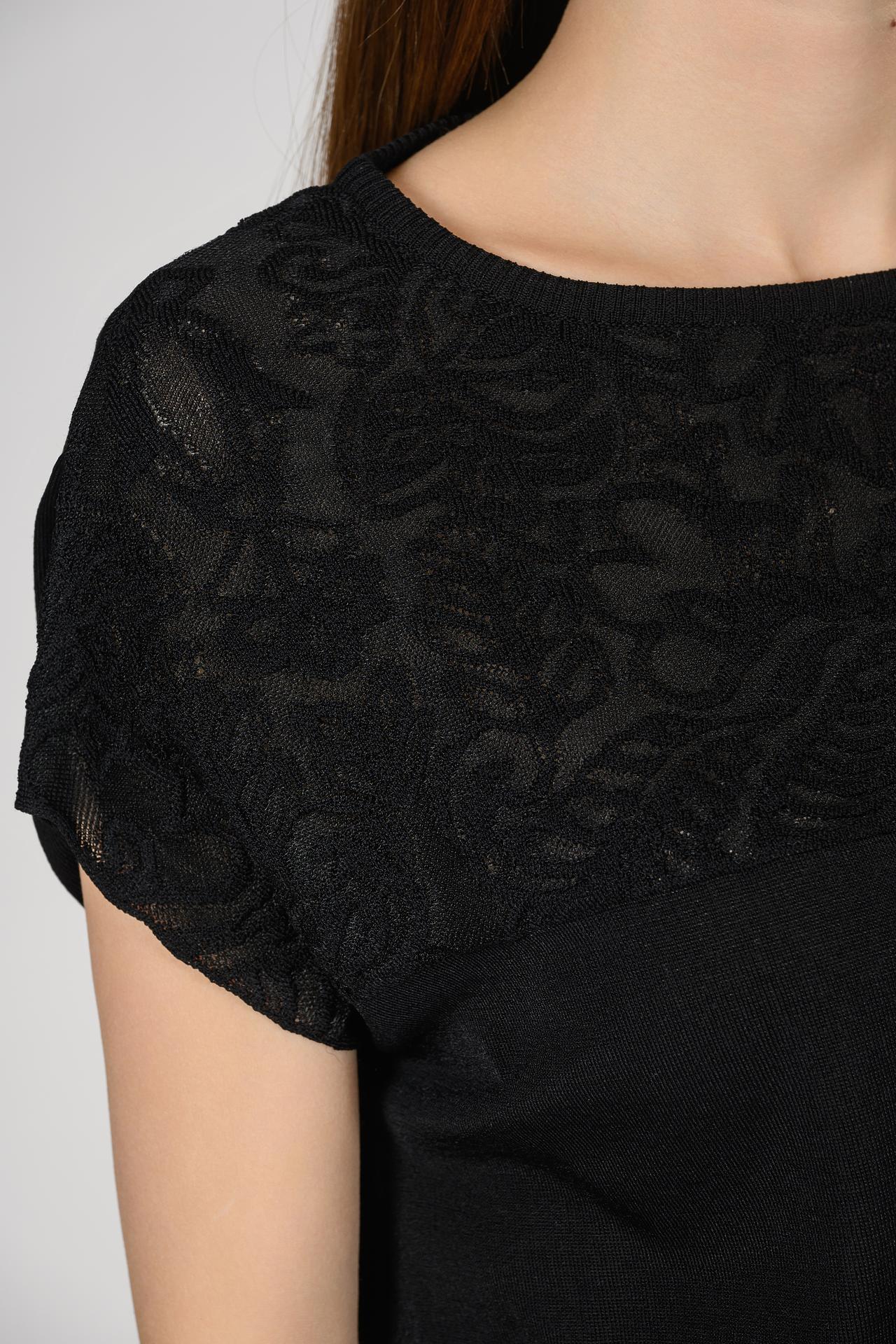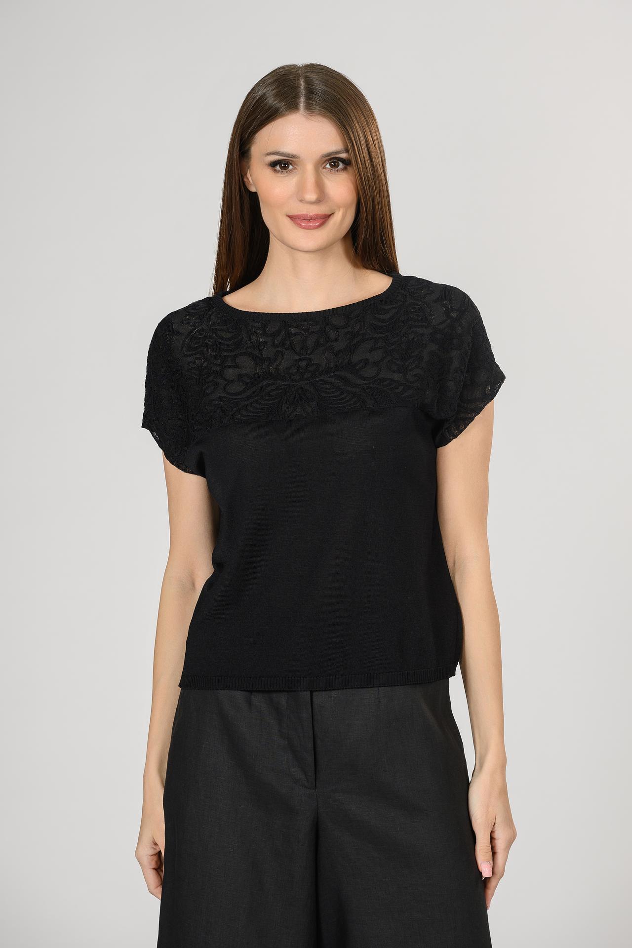 Модель выполнена из качественной смесовой пряжи, обеспечивающей приятные тактильные ощущения и долговечность. Дизайн джемпера украшен изысканной кружевной вставкой на кокетке, которая придает изделию особую женственность и утонченность. Круглый вырез горловины и короткие рукава создают лаконичный силуэт, подходящий для различных образов.