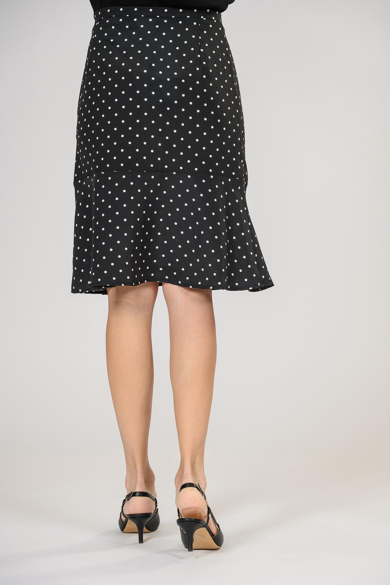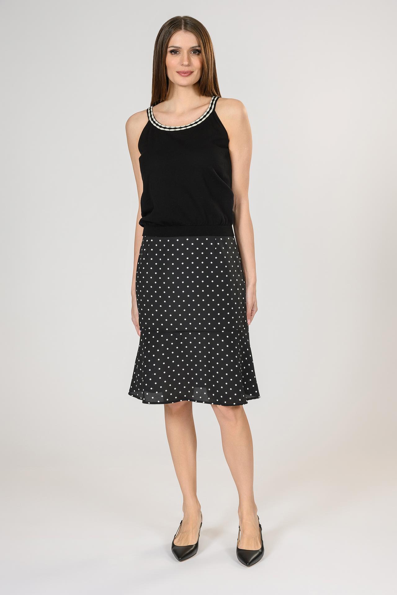 - Дизайн: Классический крой юбки подчеркивает достоинства фигуры, а принт в горошек добавляет игривости и женственности. Фасон юбки обеспечивает комфорт и свободу движений.