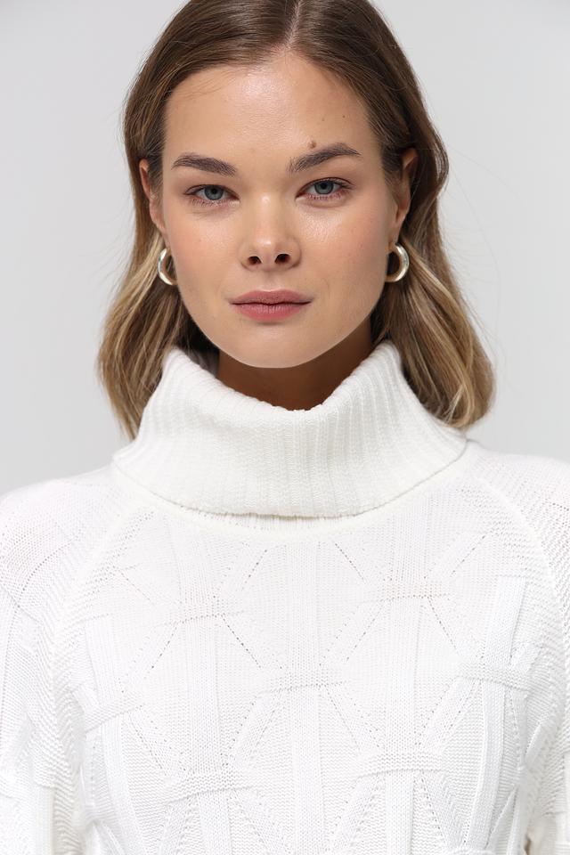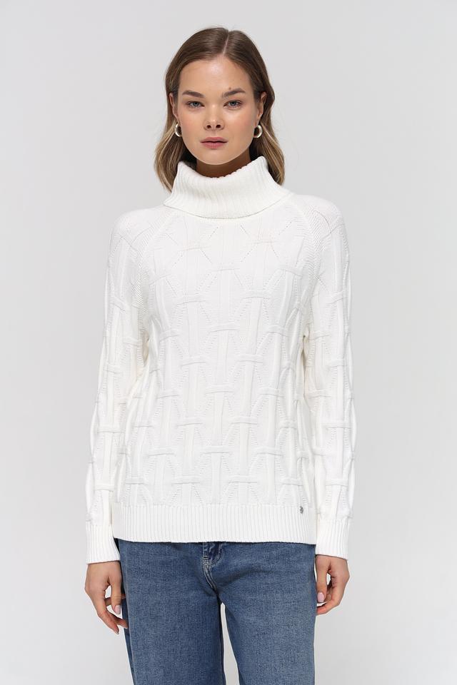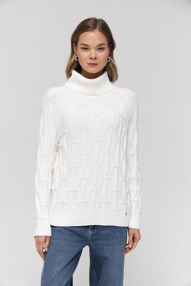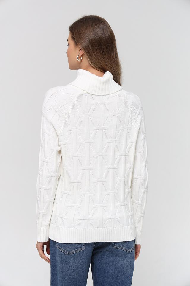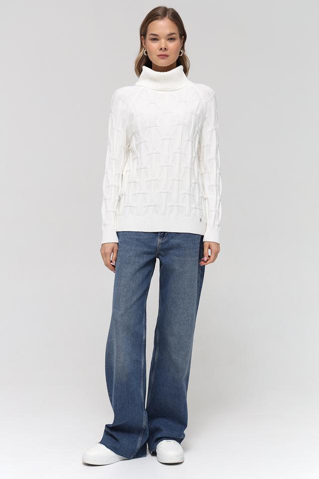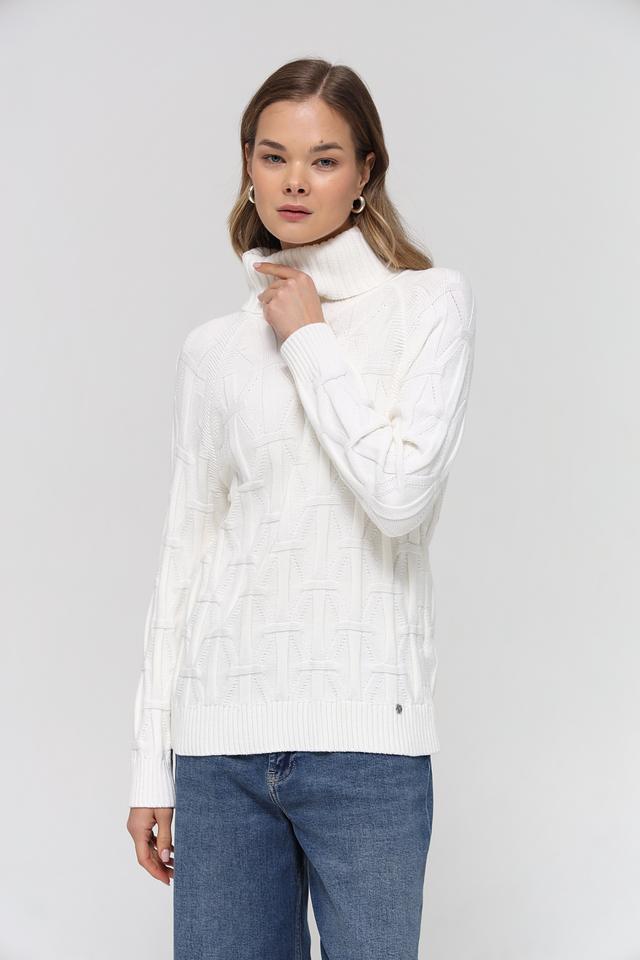 Пуловер имеет удобный крой и высокий воротник, который защищает от холода и придает образу изысканность. Особое внимание привлекает фактурный узор из кос, который добавляет изделию оригинальности и объёма.