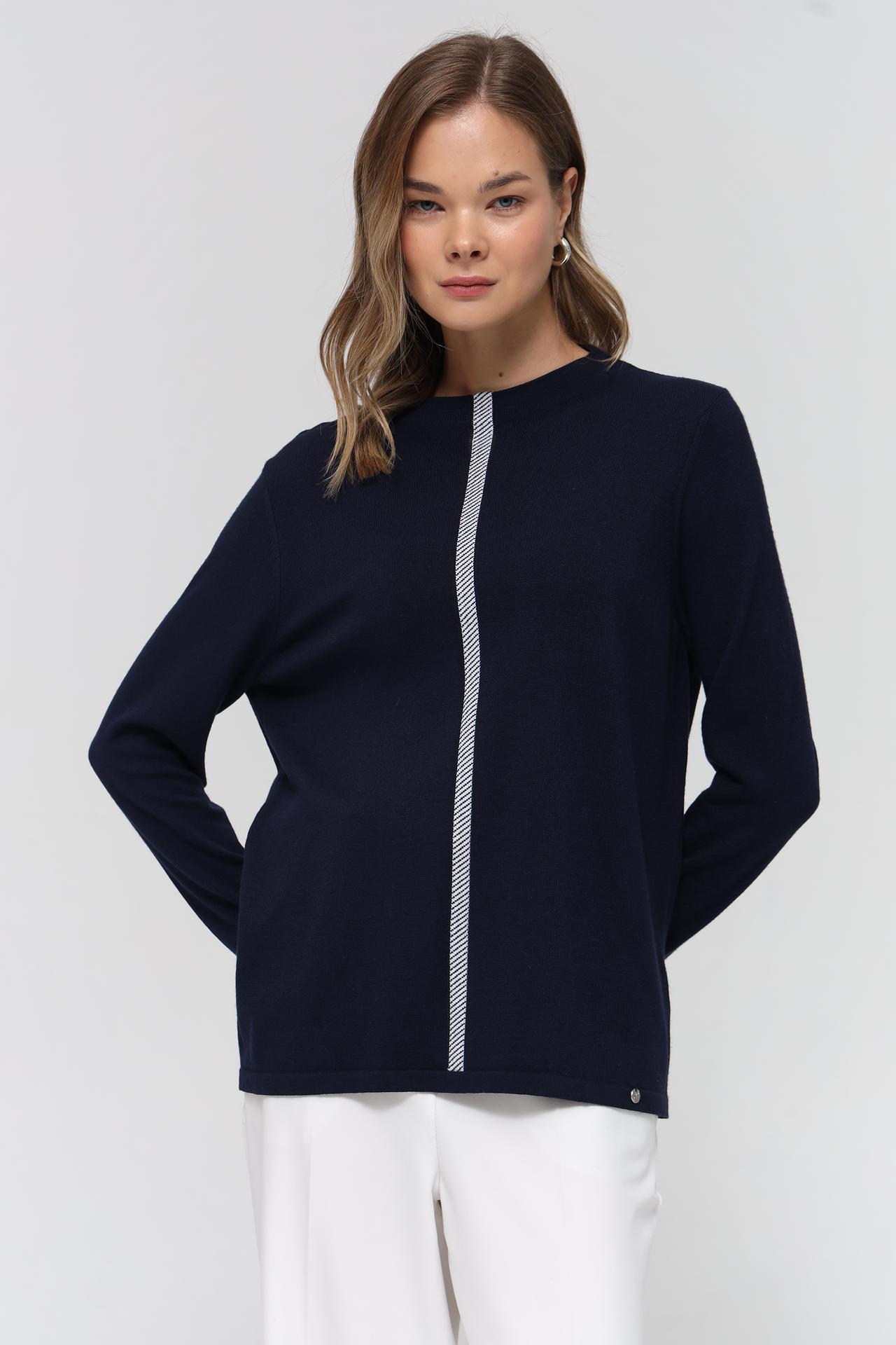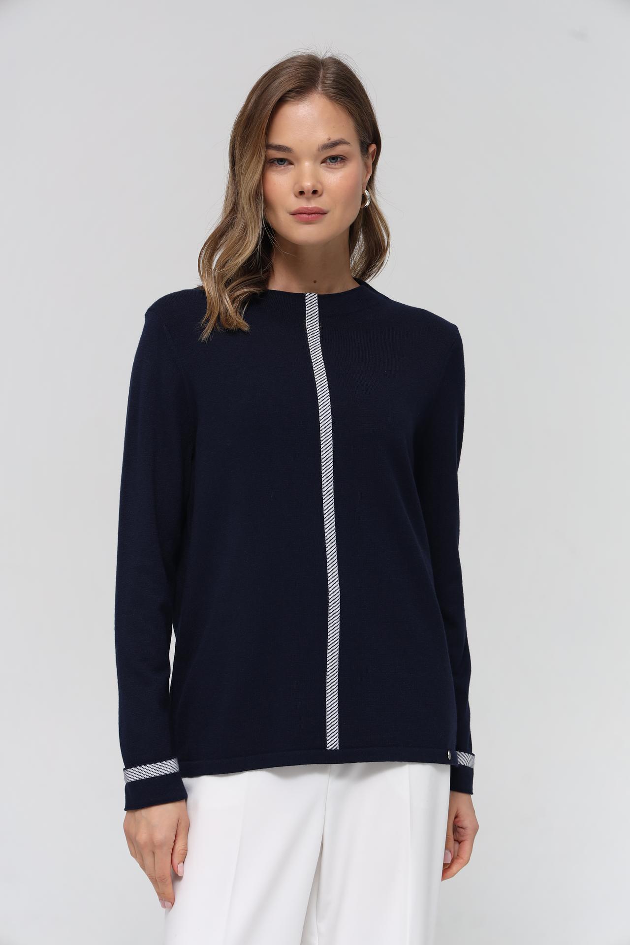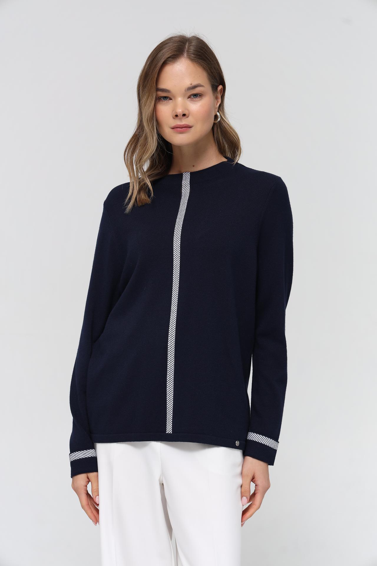 - Элегантный дизайн: Пуловер темно-синего цвета с декоративной полосой — это стильное решение для любого случая.