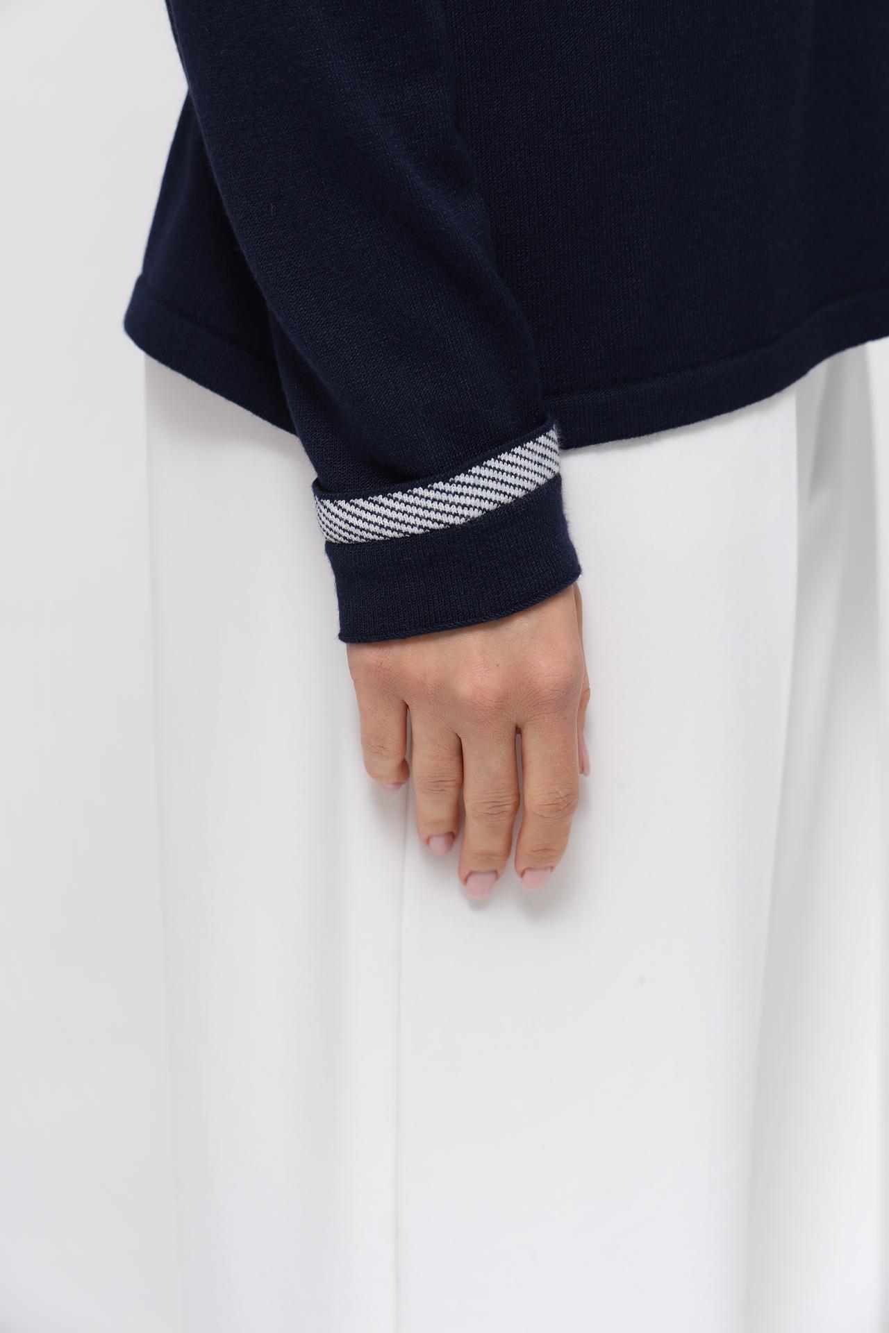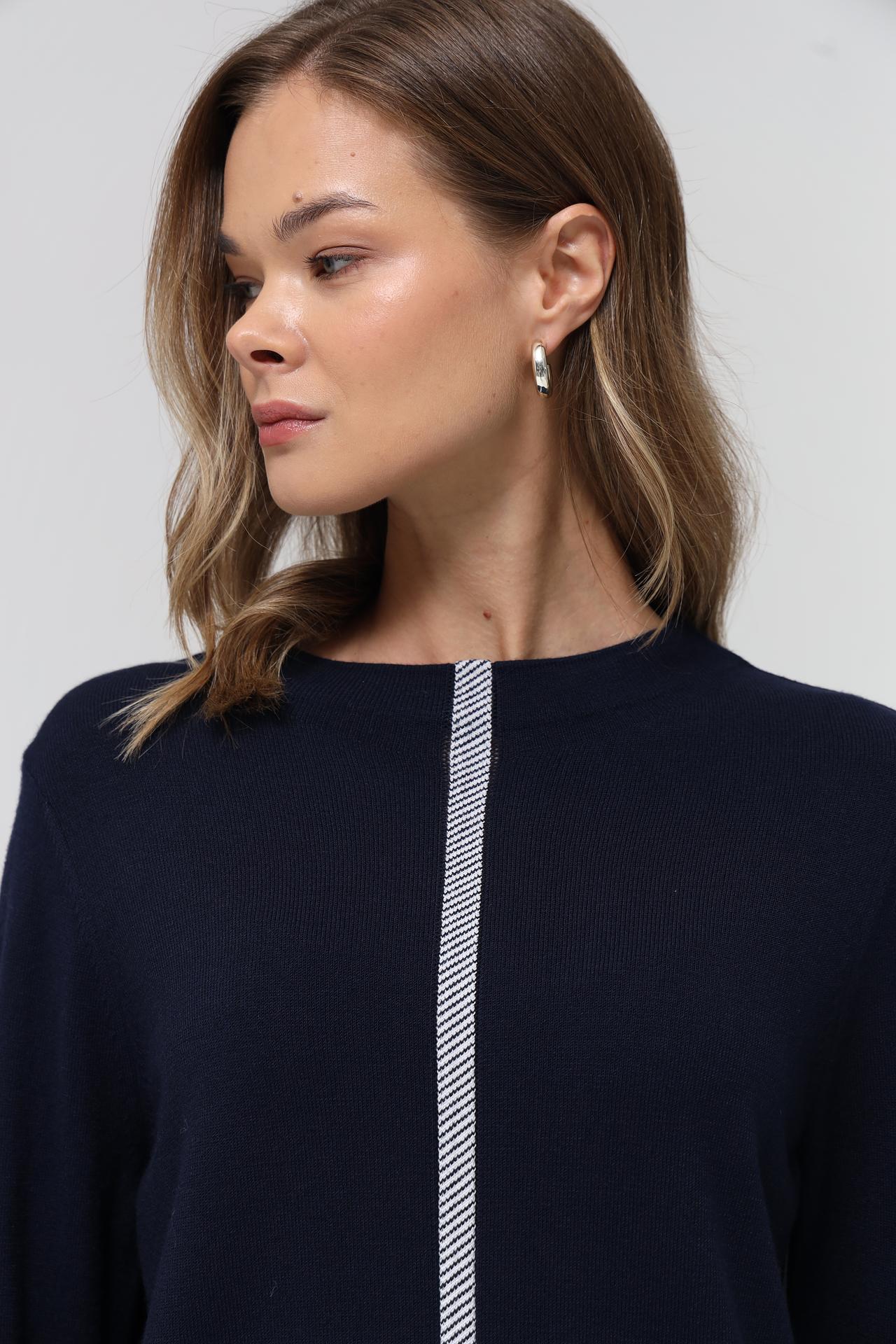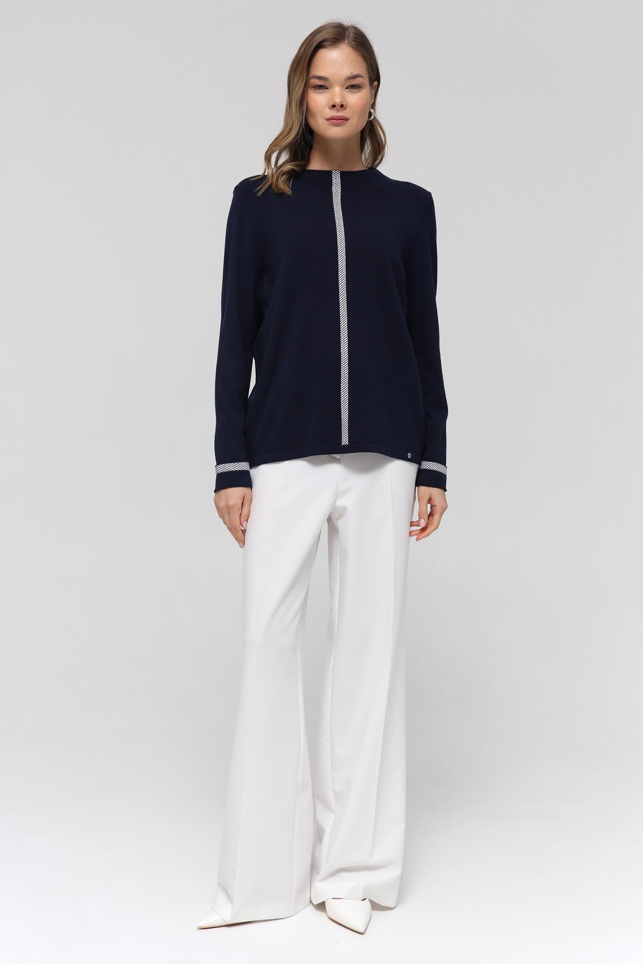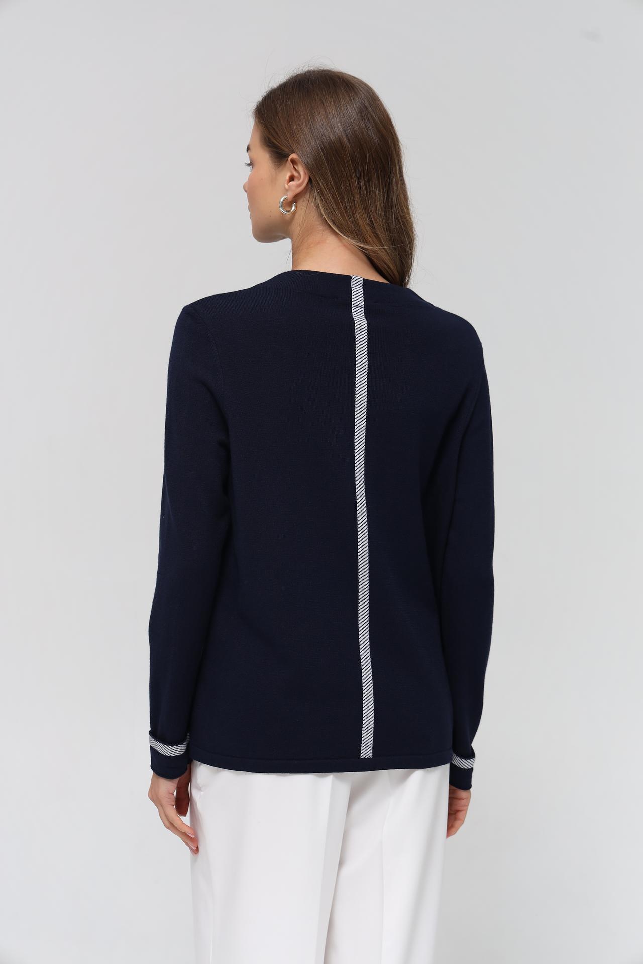 - Элегантный дизайн: Пуловер темно-синего цвета с декоративной полосой — это стильное решение для любого случая.