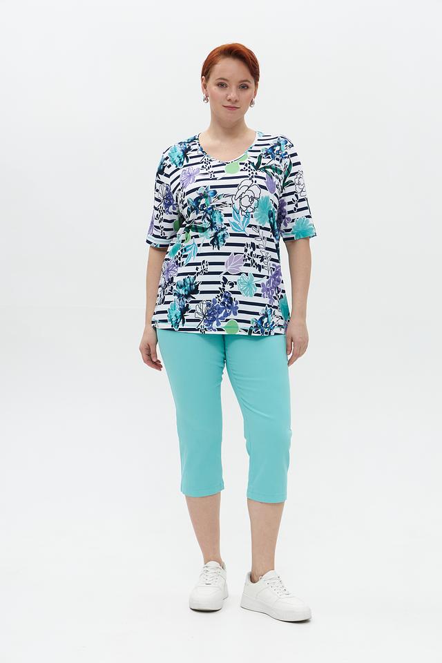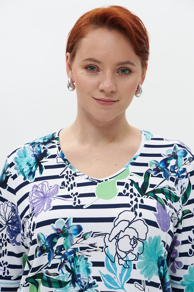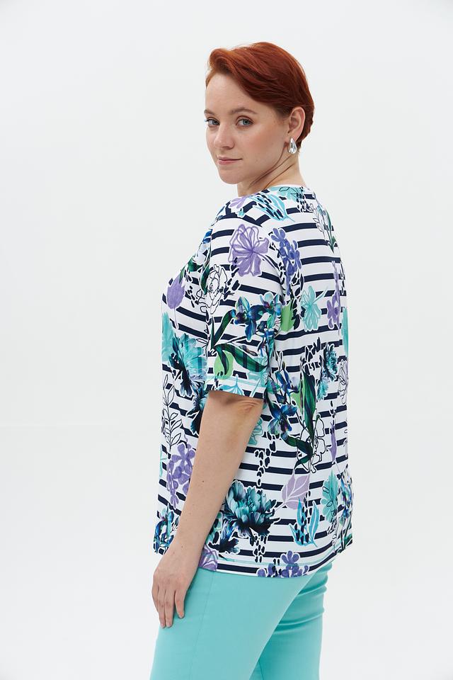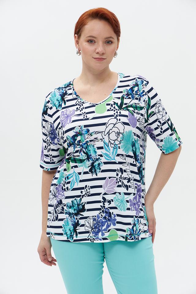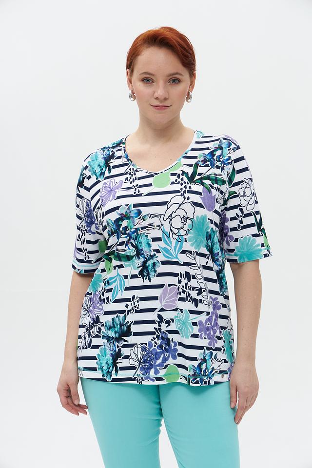 Основной цвет футболки – белый, но её украшает яркий и красочный цветочный принт, выполненный в синих, фиолетовых и зелёных тонах. Принт выполнен в сочетании с полосками, что добавляет оригинальности.