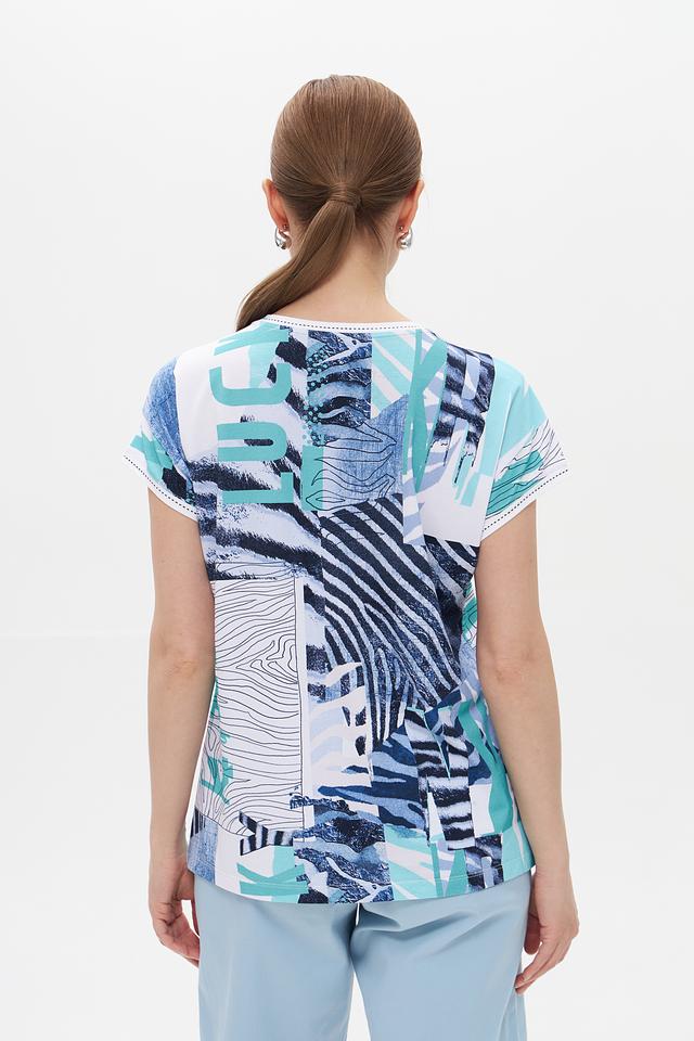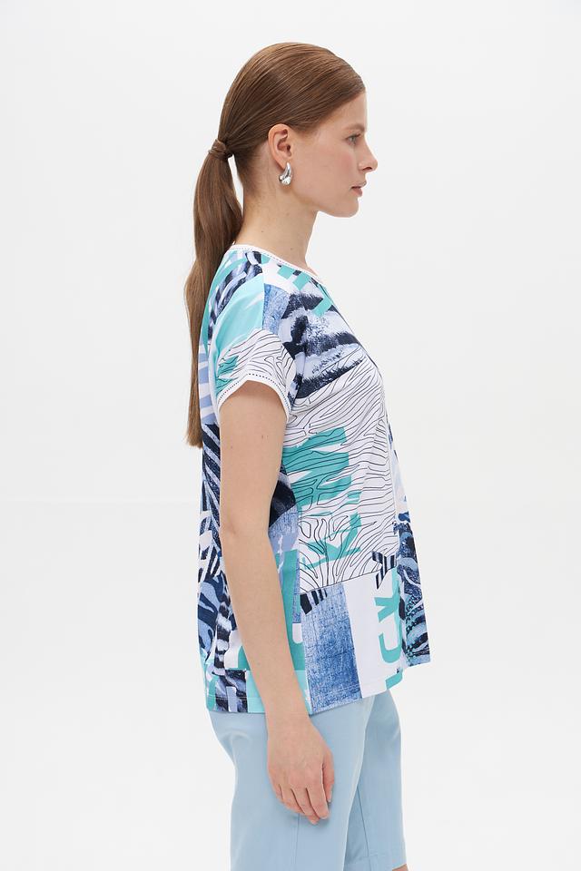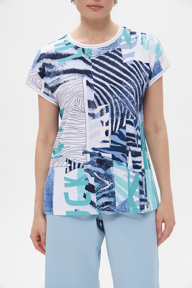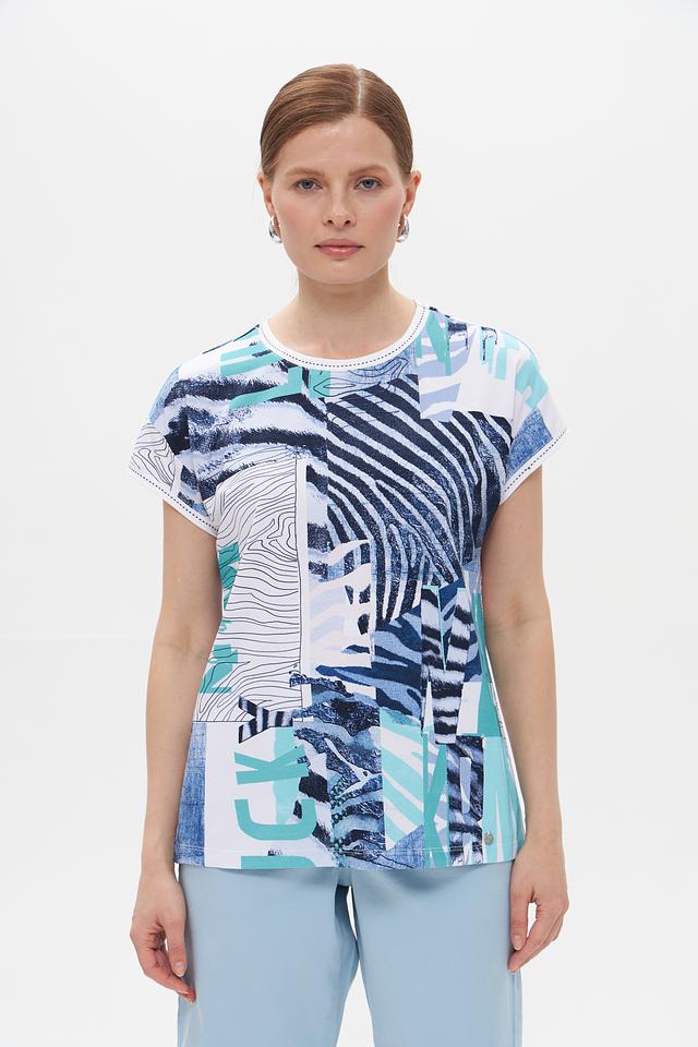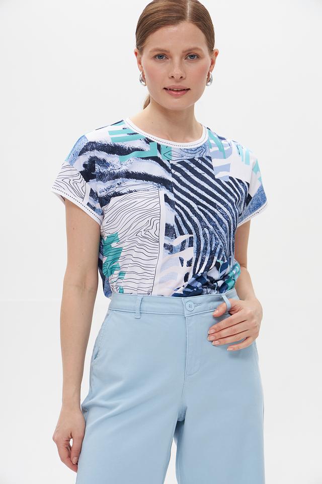 Футболка имеет прямой крой и короткие рукава. Главная особенность модели – яркий и необычный принт, выполненный в сочетании голубых, белых и синих оттенков. Принт состоит из абстрактных геометрических фигур и полос, что придает футболке современный и динамичный вид.