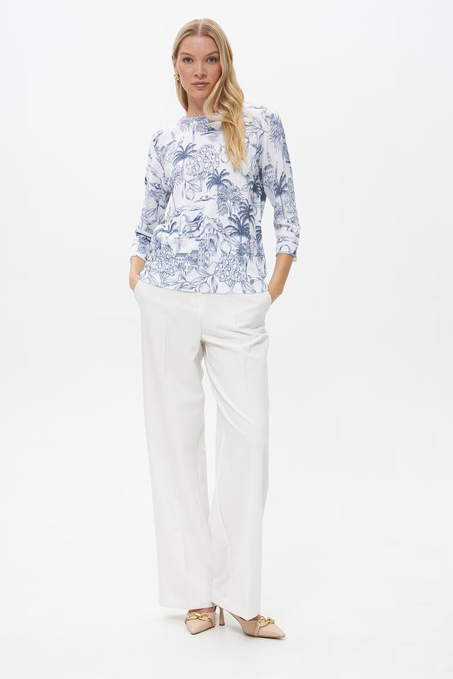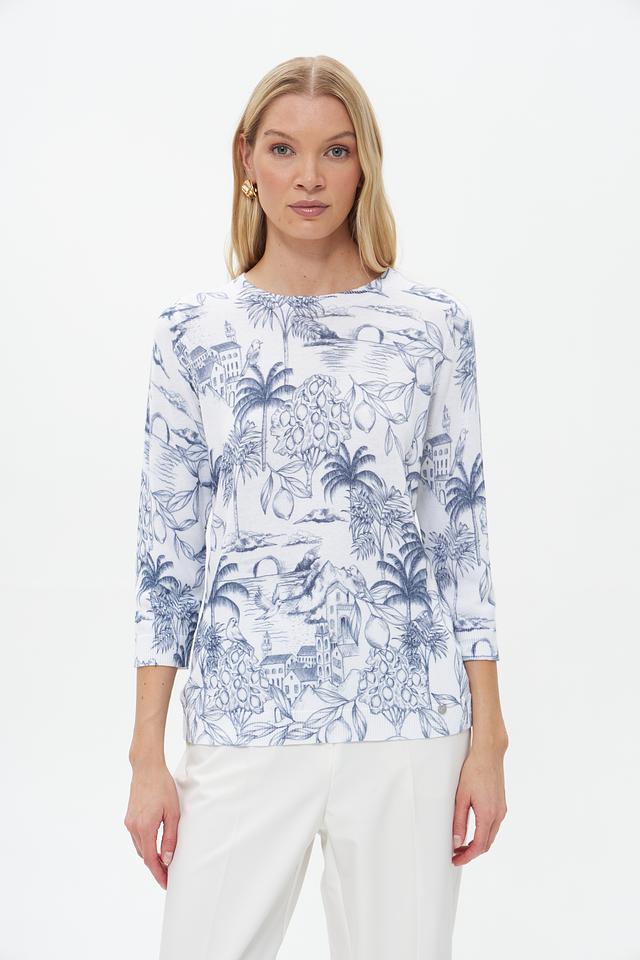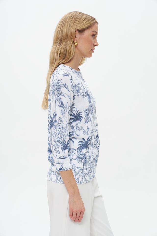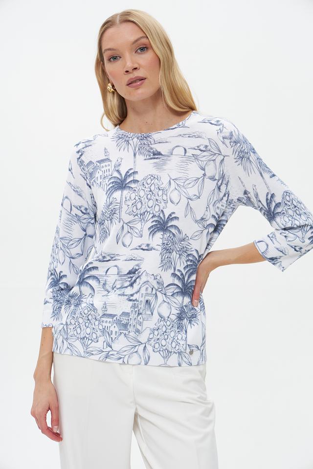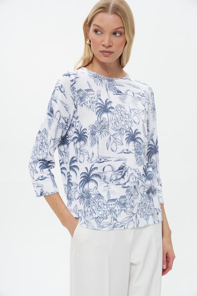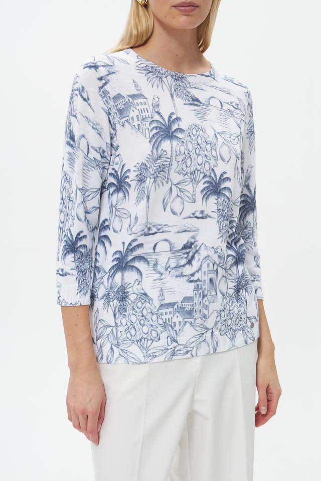 Пуловер имеет прямой крой и округлый вырез горловины. Его главная особенность – яркий и запоминающийся принт с изображением экзотических растений, архитектурных элементов и птиц, выполненный в голубых тонах на белом фоне.