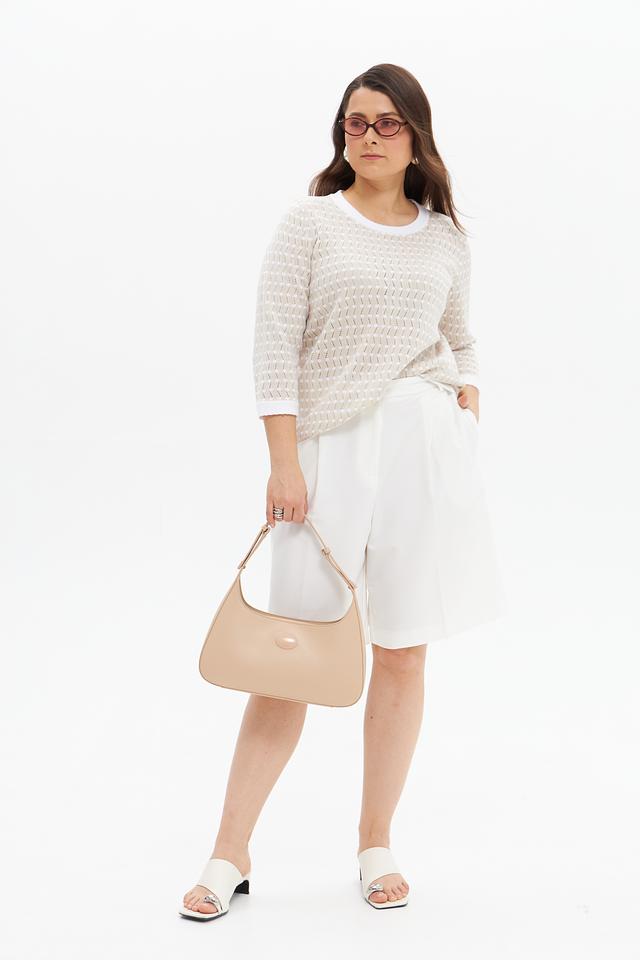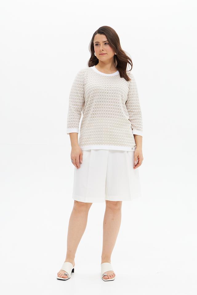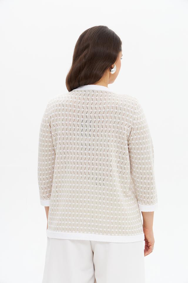 Модель имеет круглый вырез горловины, отделанный белой окантовкой, и рукава 3/4. Пуловер имеет свободный крой, который обеспечивает комфортную посадку по фигуре. Сочетание хлопка и полиакрила делает его приятным к телу и практичным в уходе.