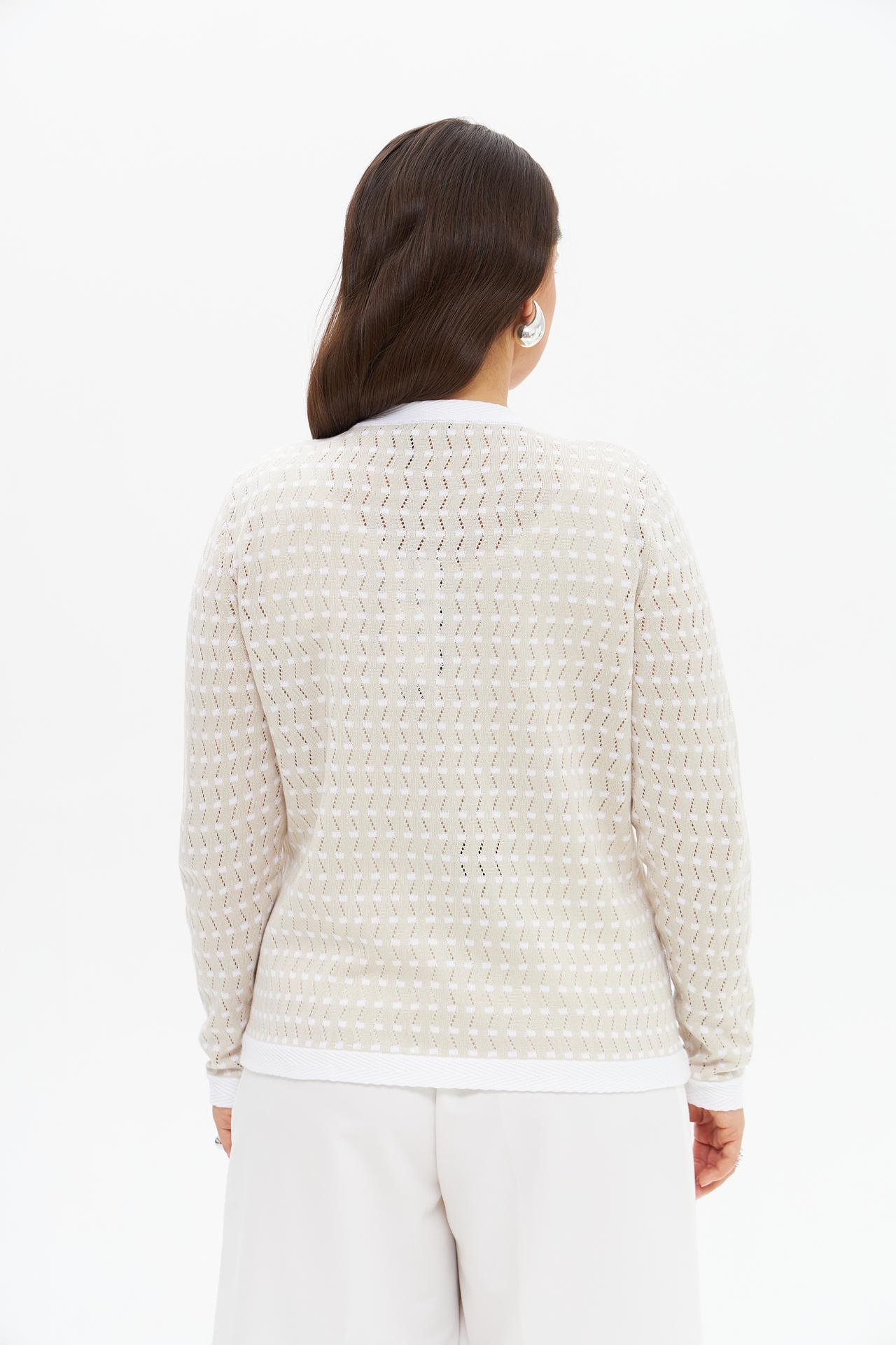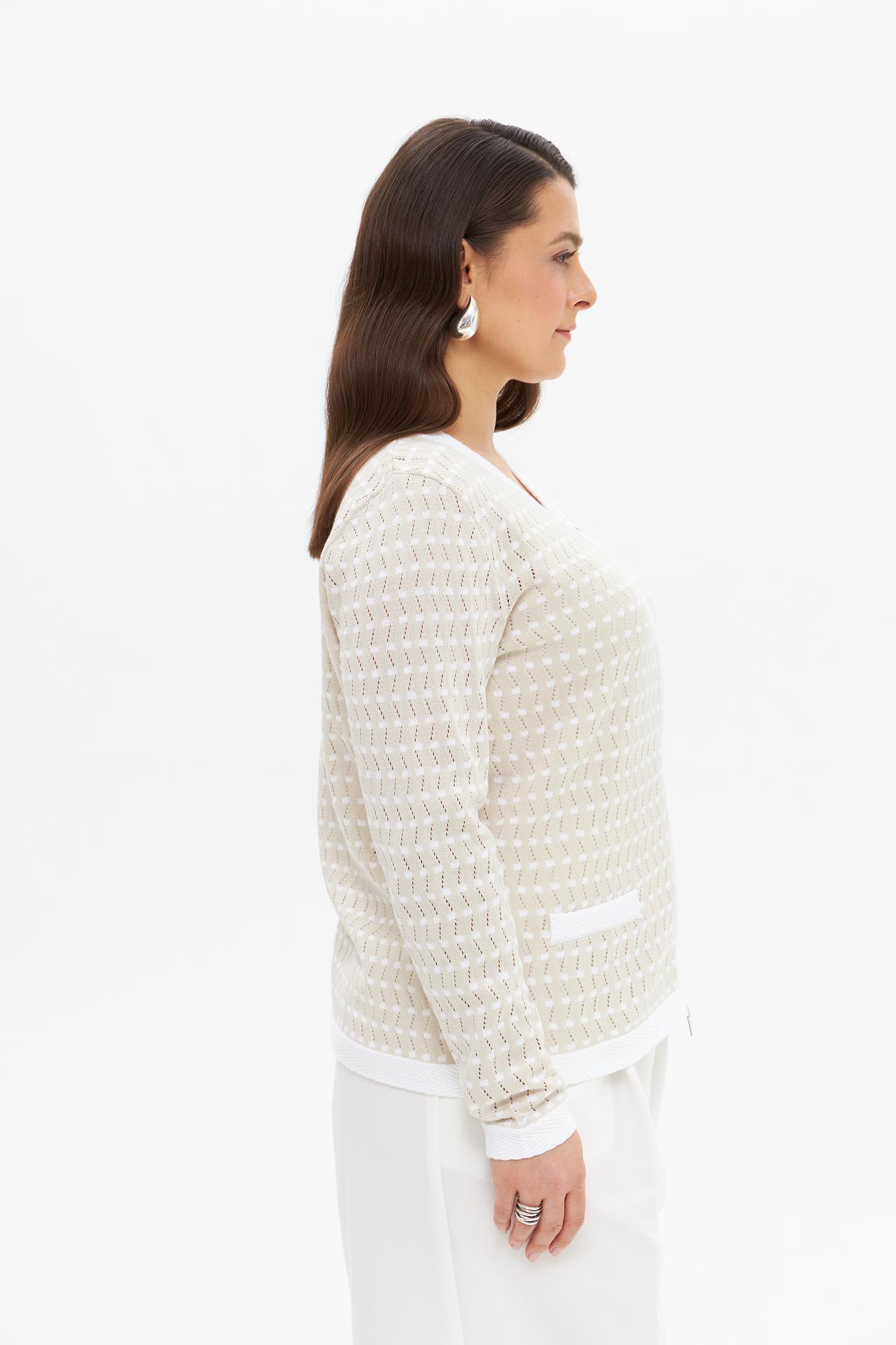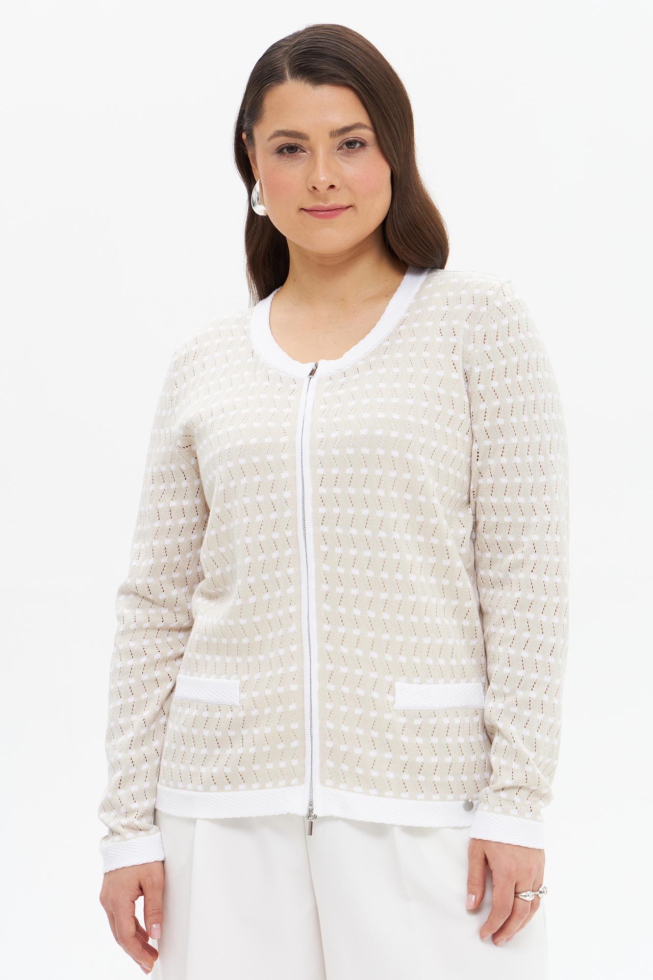 Жакет выполнен из высококачественного материала (50% хлопок, 50% полиакрил), что гарантирует долговечность и простоту в уходе. Белая отделка добавляет свежести и изысканности. Этот вязаный жакет на молнии станет вашим любимым предметом одежды на каждый день!