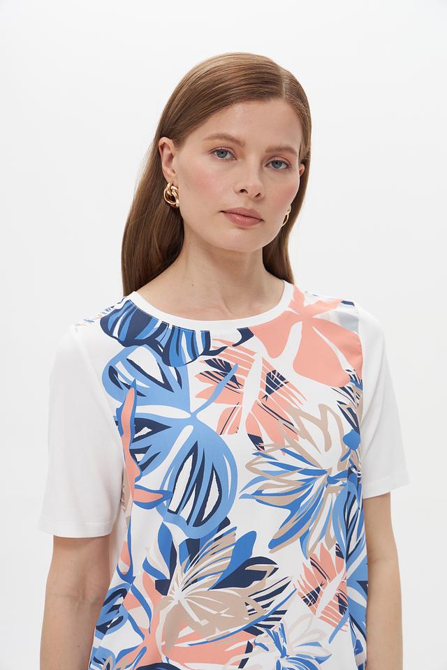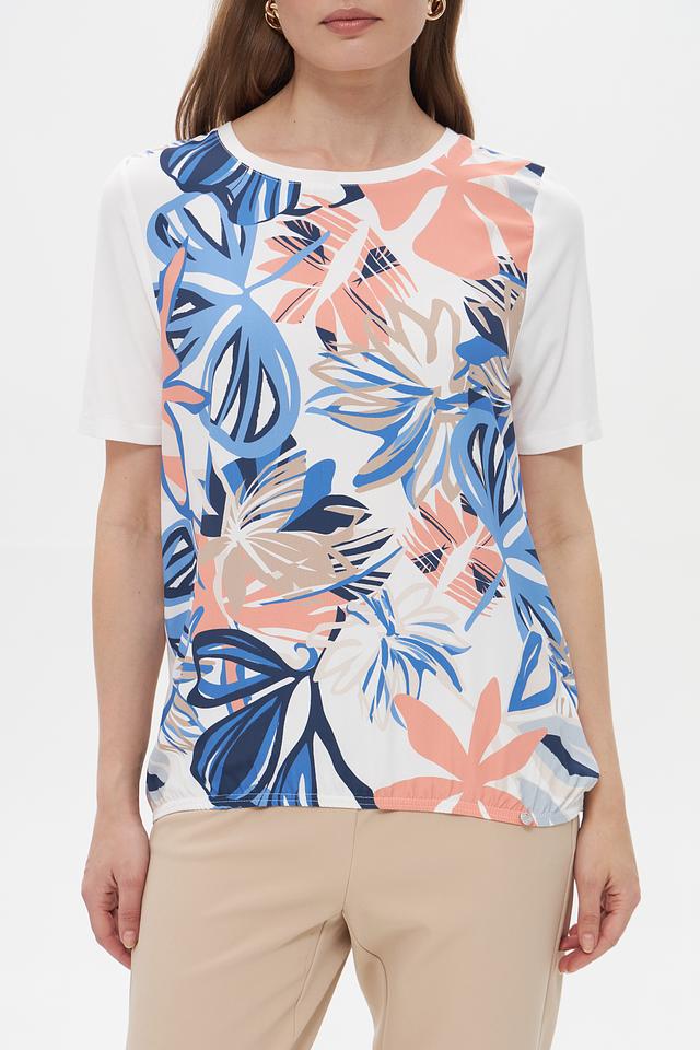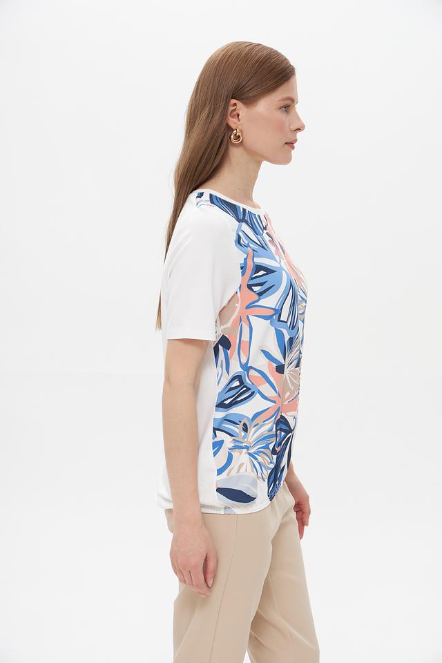 Основной цвет футболки – белый, а яркий тропический принт добавляет образу свежести и оригинальности. Рисунок включает в себя элементы синего, коричневого и розового цветов, создавая гармоничное сочетание.