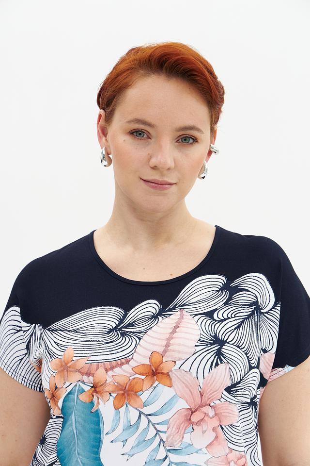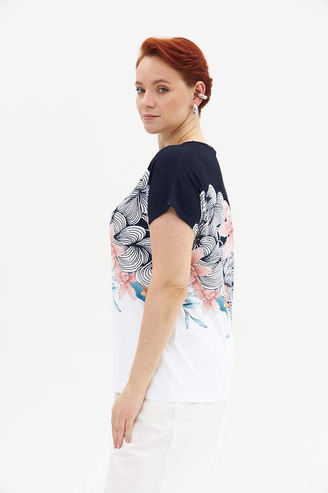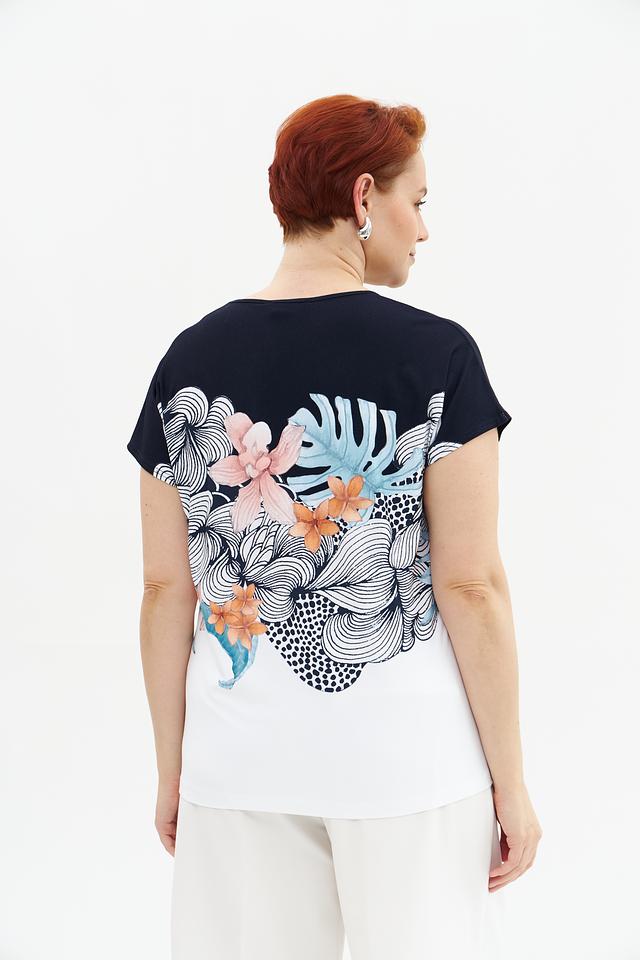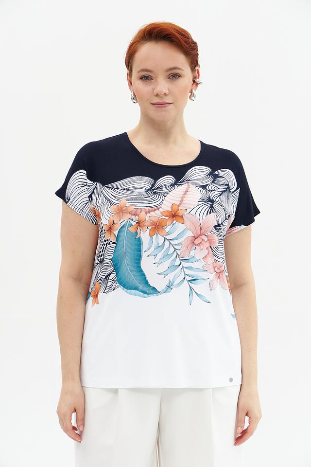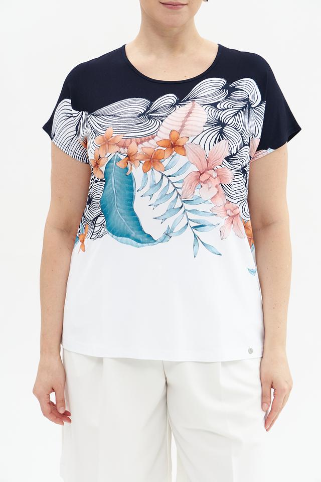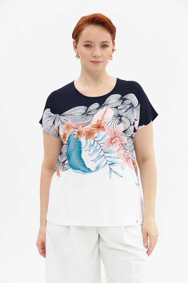 Женская футболка Gollehaug темно-синего и белого цвета с ярким цветочным принтом. Изготовлена из мягкой вискозы с добавлением эластана для комфорта и хорошей посадки. Состав: вискоза 95%, эластан 5%