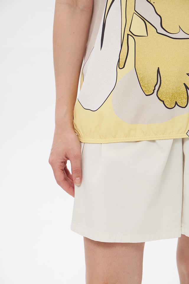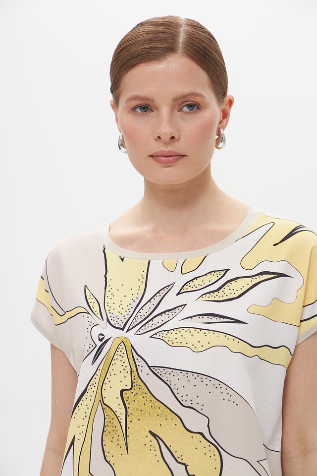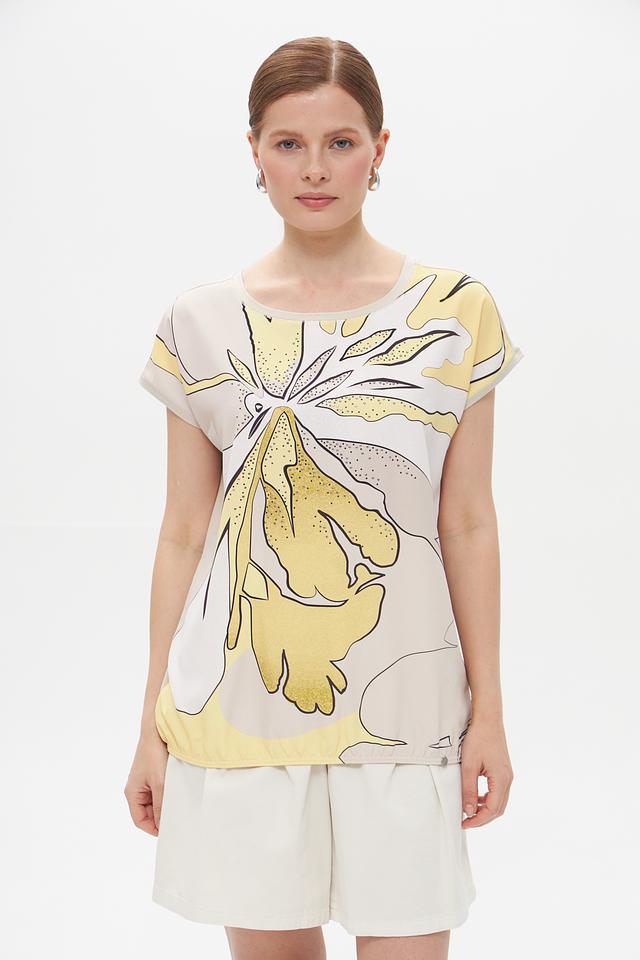Основной цвет футболки – бежевый, который служит идеальным фоном для яркого и необычного принта в виде стилизованных листьев. Принт выполнен в жёлтых и чёрных тонах, добавляя образу оригинальности и динамики.