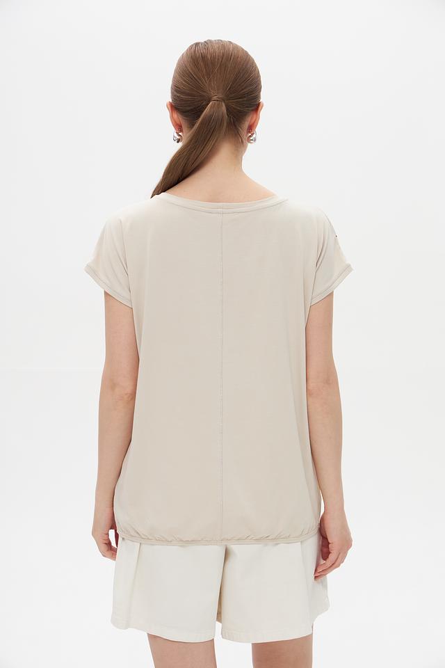 Фасон футболки – свободный, с короткими рукавами и округлым вырезом горловины. Сбоку на подоле имеется небольшая сборка, которая придает футболке более женственный силуэт. Задняя часть футболки однотонная, без принта.