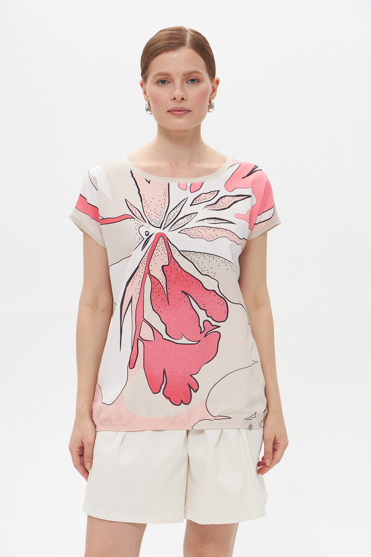Футболка украшена выразительным цветочным принтом в нежных оттенках, который придает изделию особое очарование. Декоративные элементы в виде мелких страз добавляют изысканный блеск, подчеркивая индивидуальность вашего стиля.