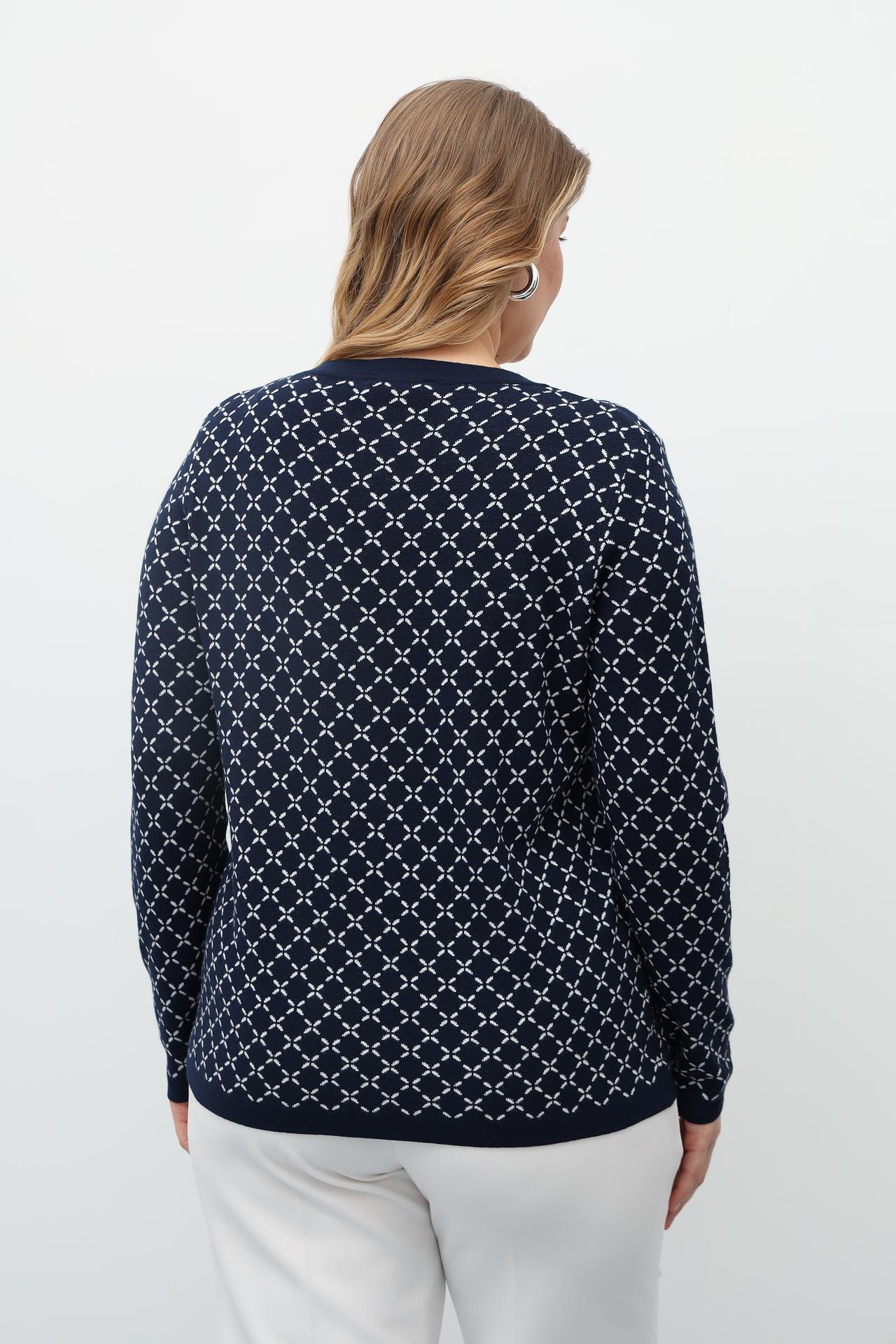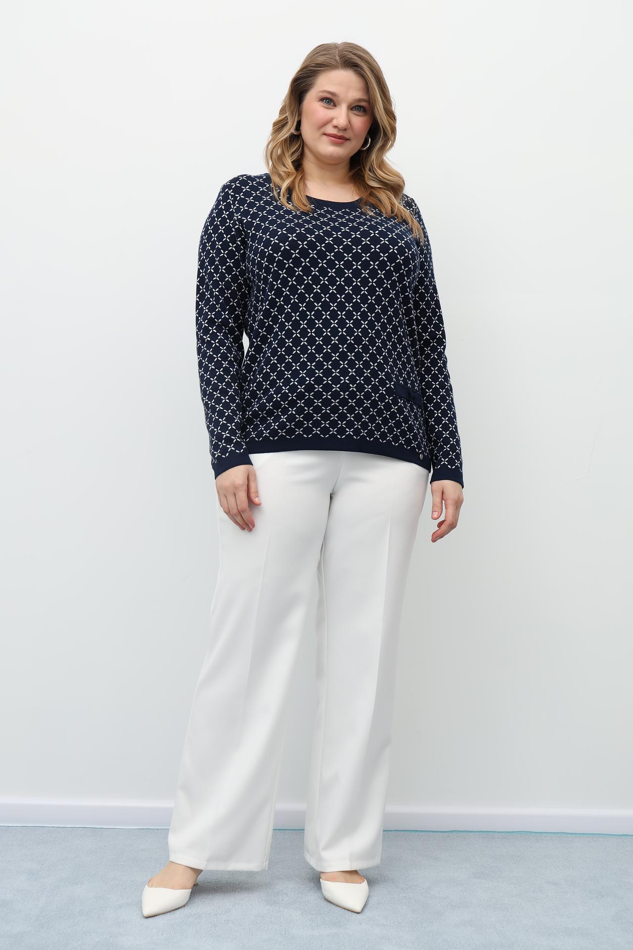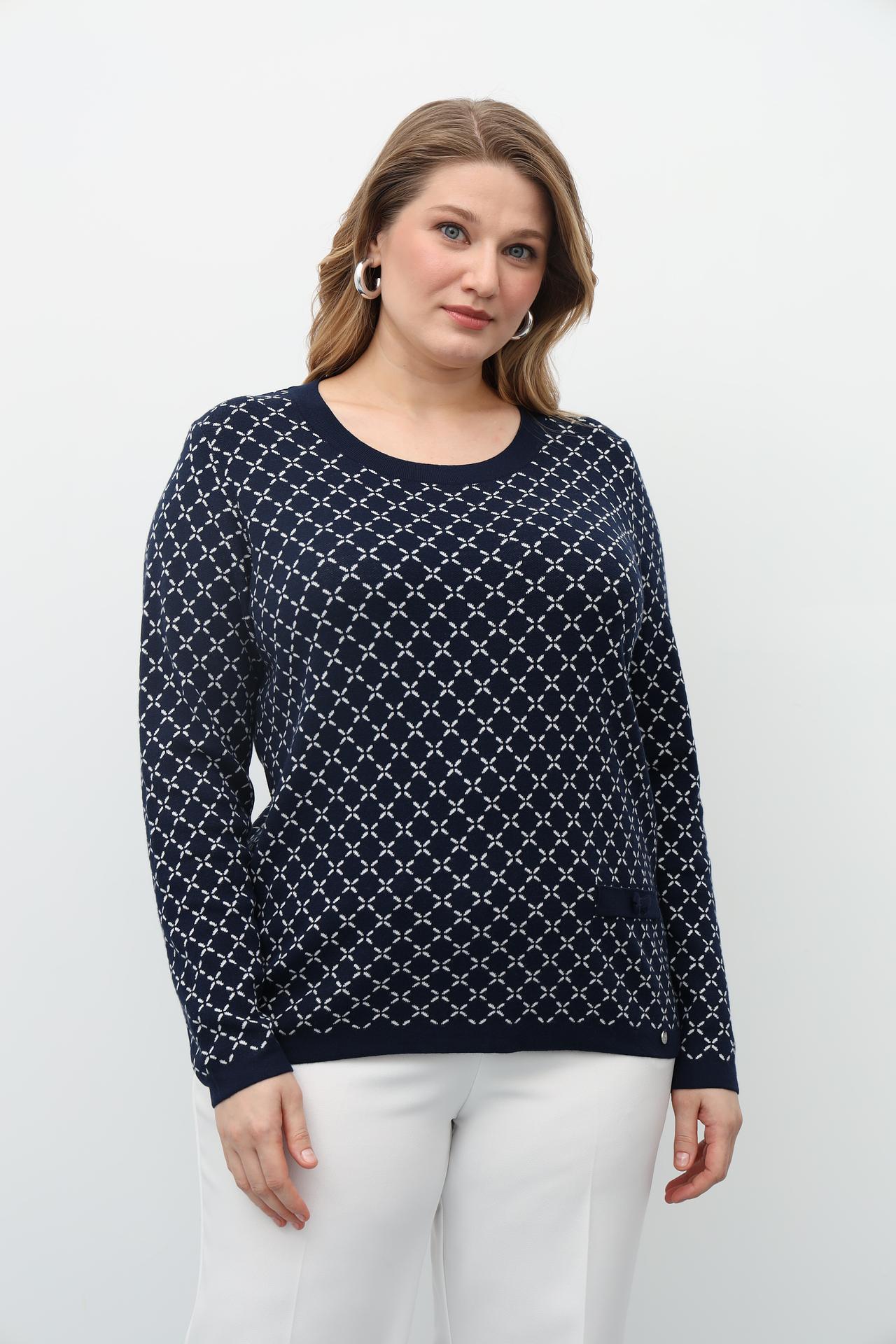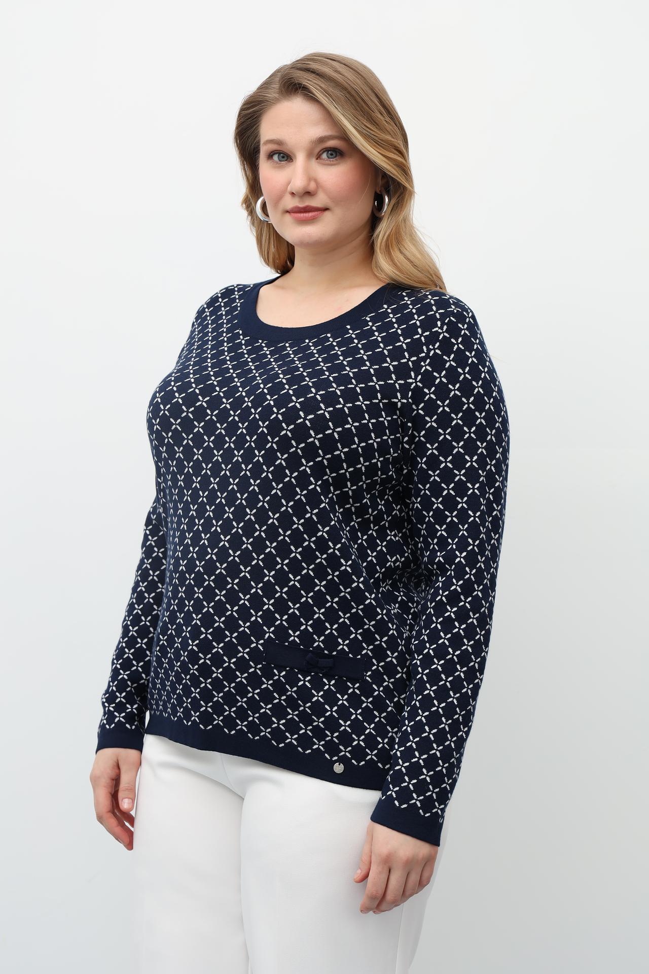 - Дизайн и крой: Пуловер имеет классический круглый вырез и длинные рукава, что делает его универсальным для любого случая. Утонченный геометрический узор добавляет актуальности и стиля, а небольшой накладной карман спереди придает дополнительный акцент.