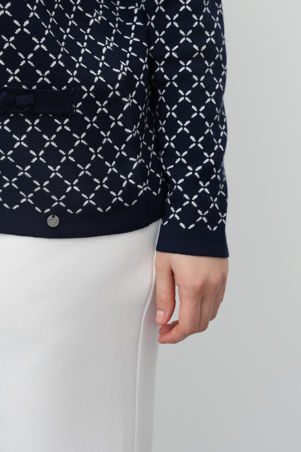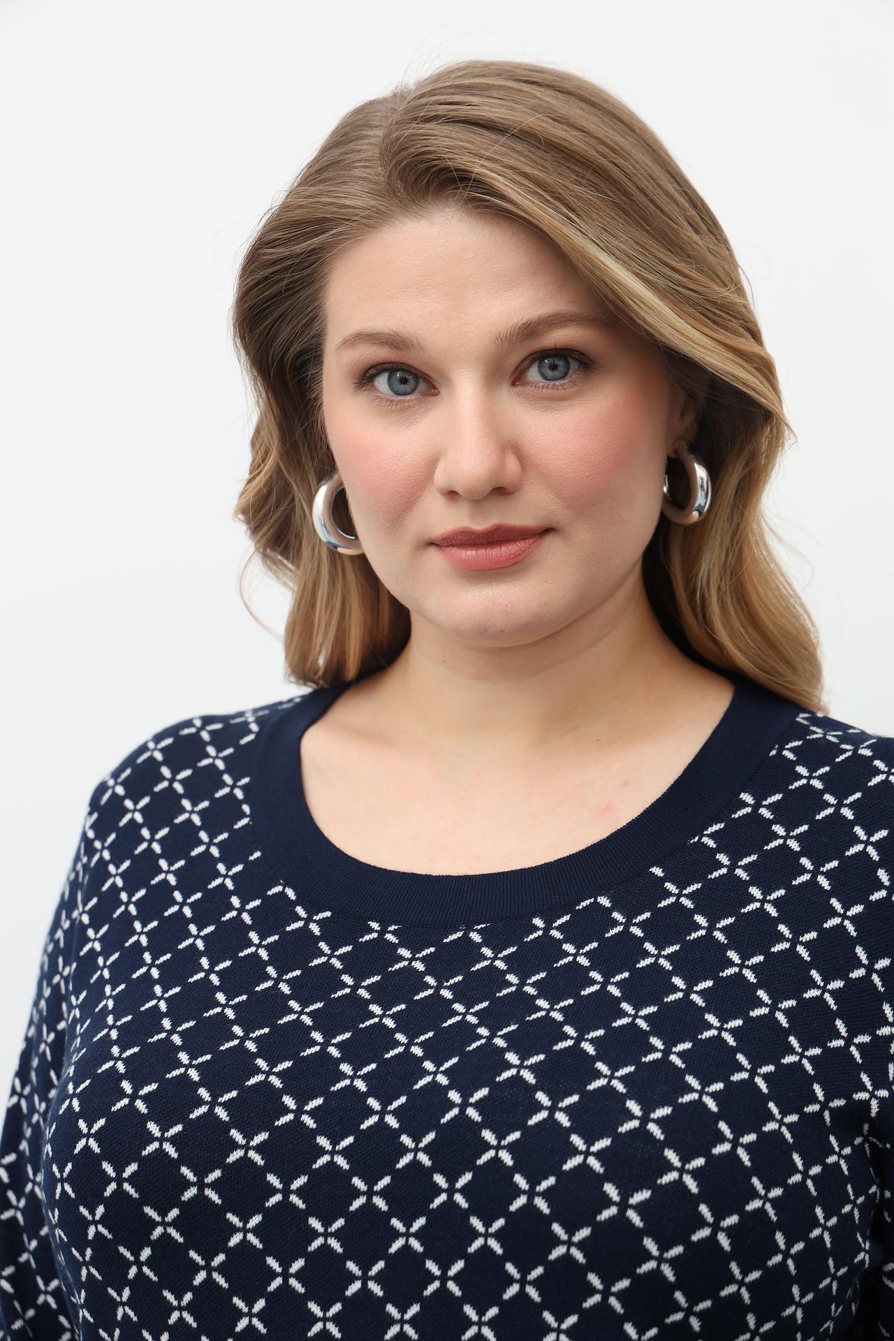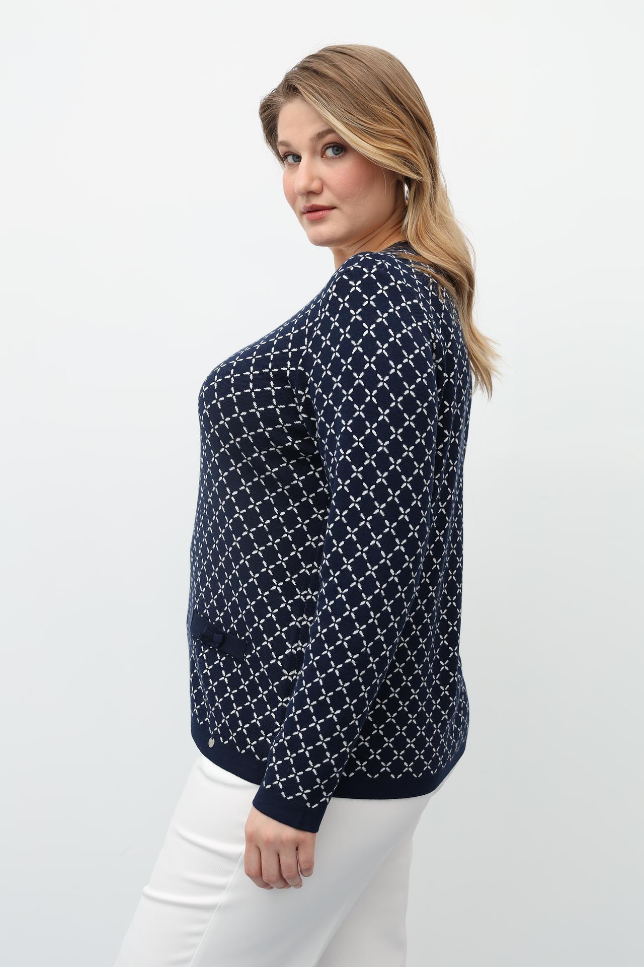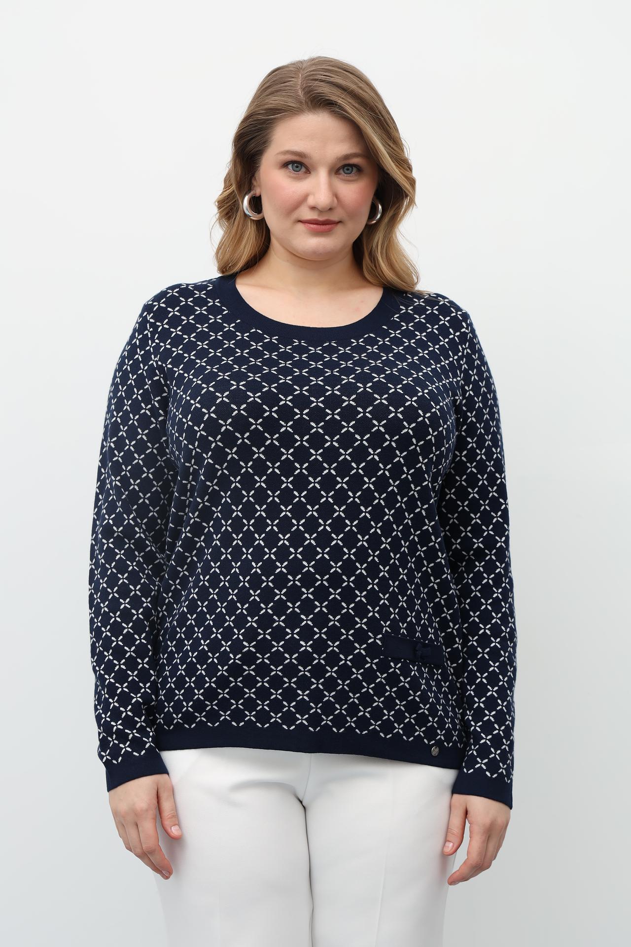 - Дизайн и крой: Пуловер имеет классический круглый вырез и длинные рукава, что делает его универсальным для любого случая. Утонченный геометрический узор добавляет актуальности и стиля, а небольшой накладной карман спереди придает дополнительный акцент.