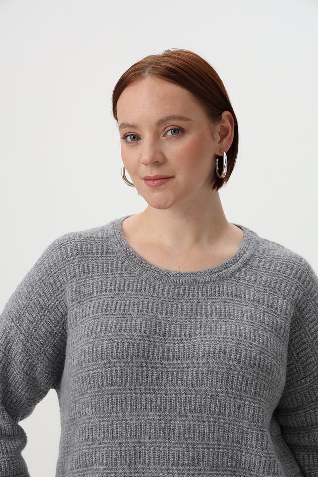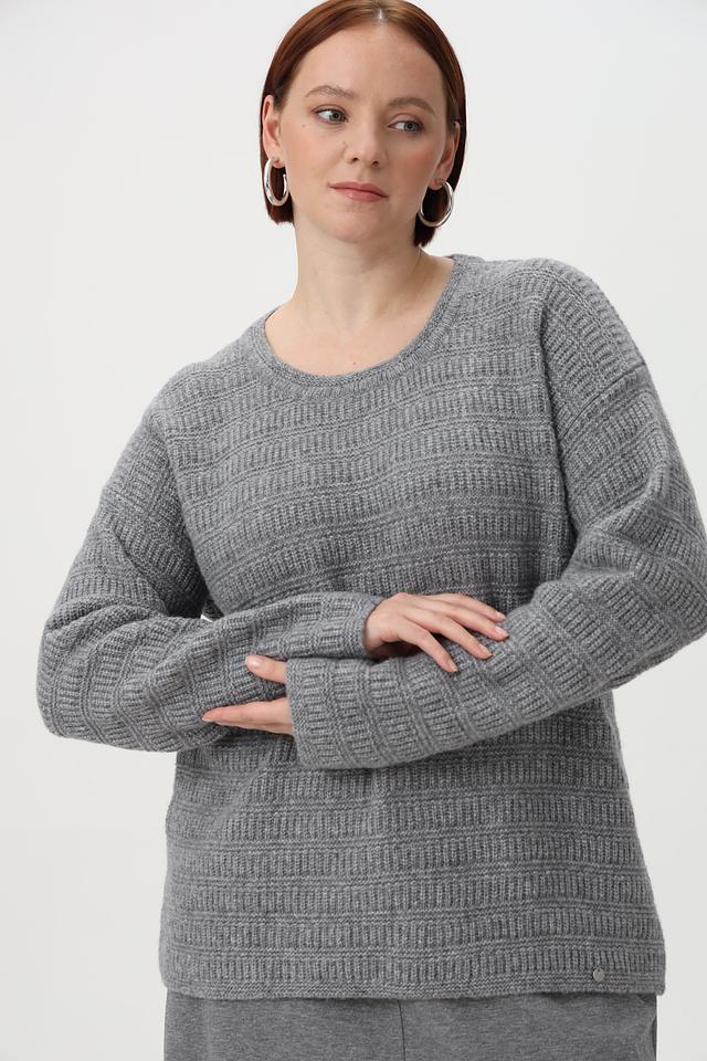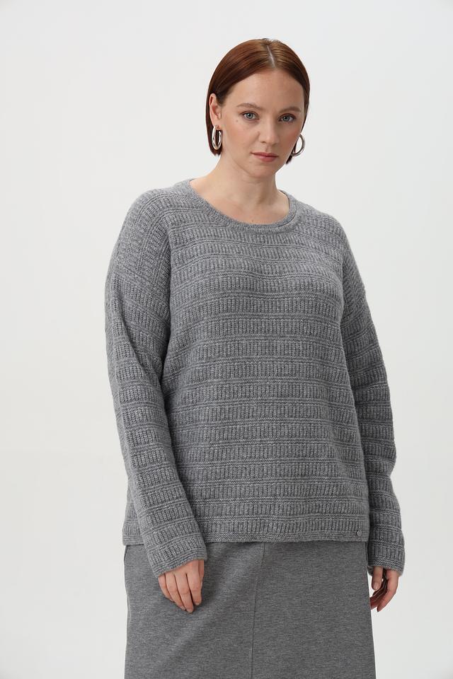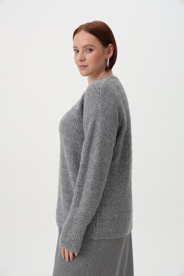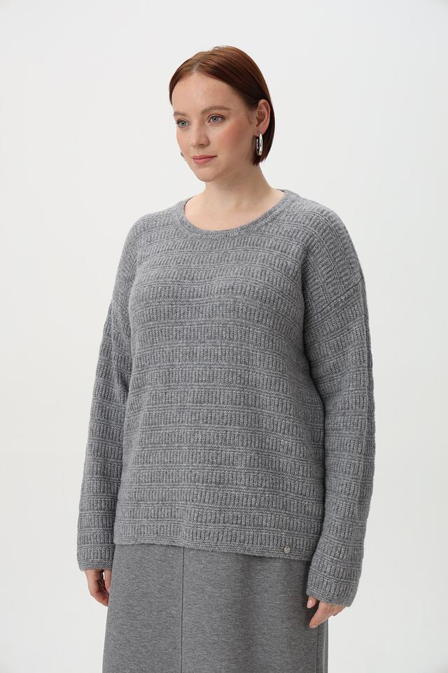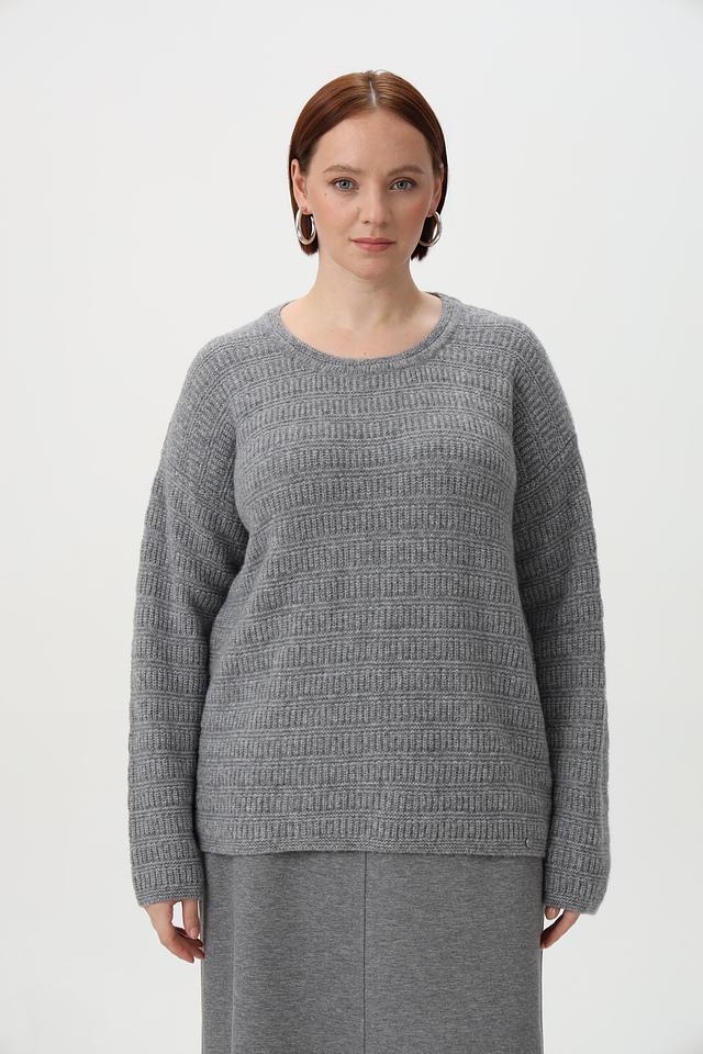 Пуловер имеет круглый вырез горловины и длинные рукава. Особый шарм изделию придает оригинальный узор, выполненный в технике вязания. Свободный крой обеспечивает комфортную посадку по фигуре.