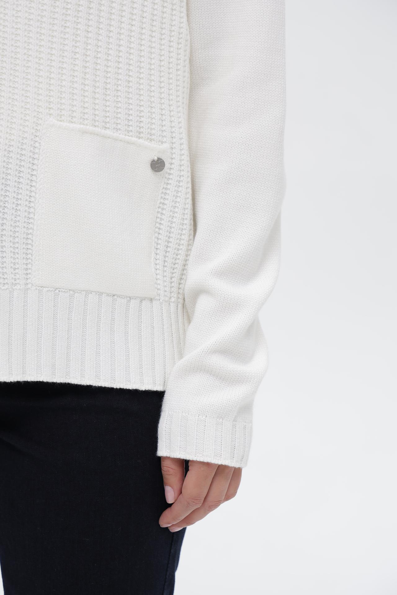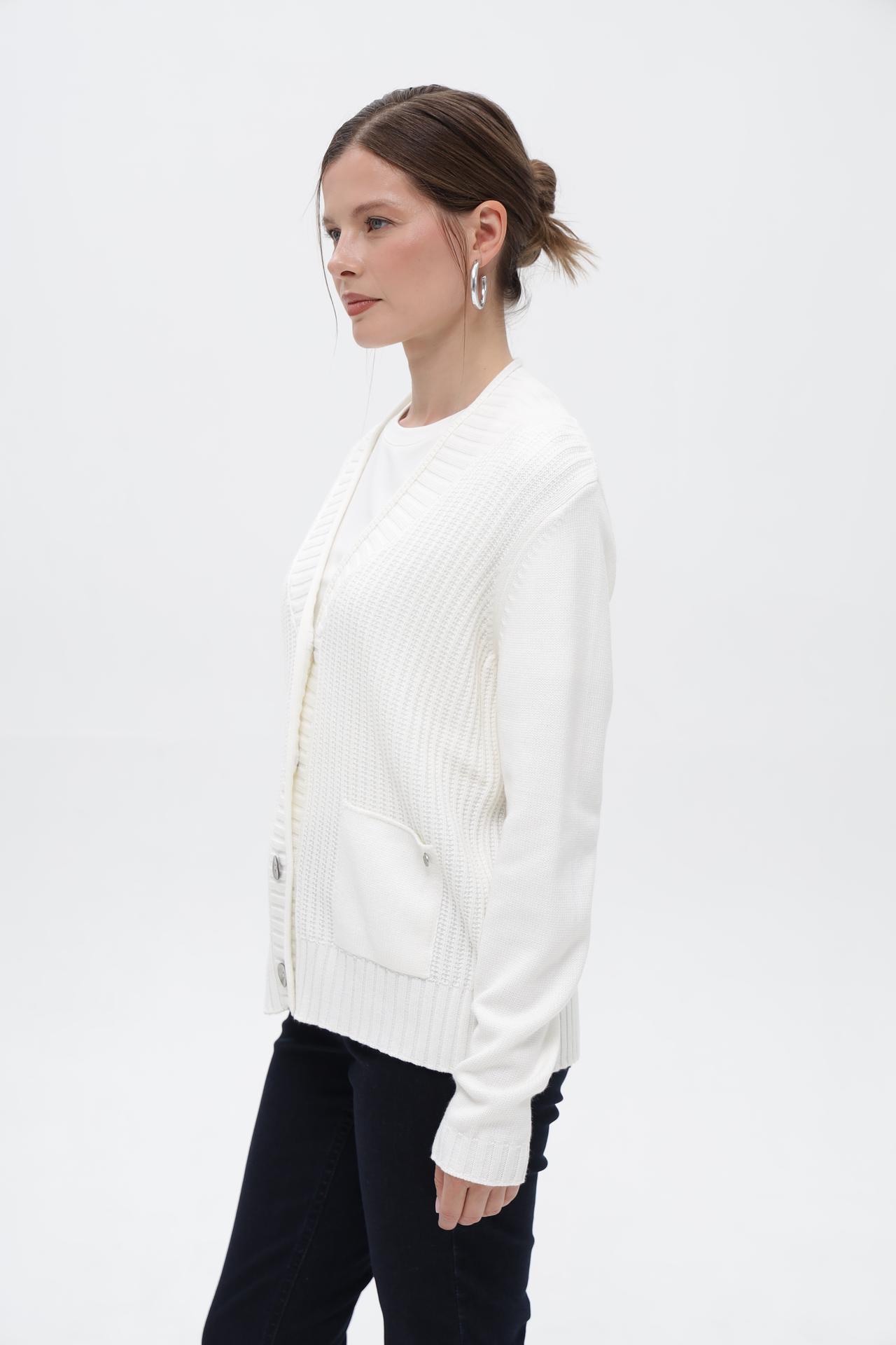 - Изысканный дизайн: Белый жакет с фактурной вязкой и широкой резинкой по низу и на манжетах выглядит очень стильно. Аккуратный V-образный вырез и прямой силуэт подчеркивают женственность, при этом не стесняя движений.