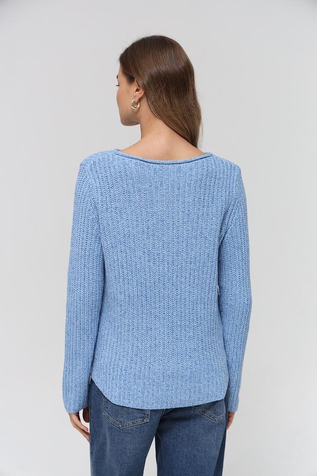 Пуловер имеет классический прямой крой и круглый вырез горловины, что делает его универсальным для различных образов. Текстурная вязка придает изделию особый шарм и объём. Голубой цвет пуловера легко сочетается с другими элементами одежды, позволяя создавать разнообразные стильные комплекты.