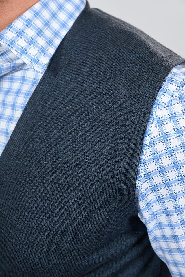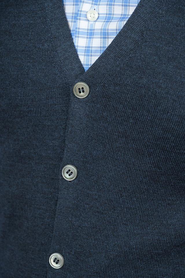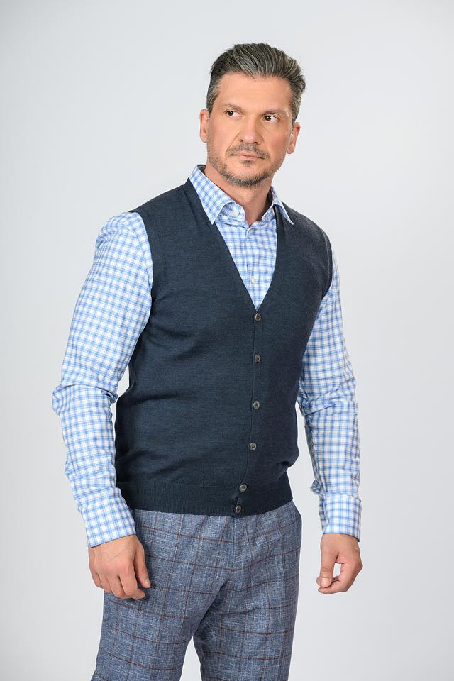 Жилет имеет классический крой, который хорошо сочетается с рубашками и брюками. Тёмно-синий цвет делает его универсальным и подходящим для различных случаев. Застёжка на пуговицы обеспечивает удобство надевания и снятия.