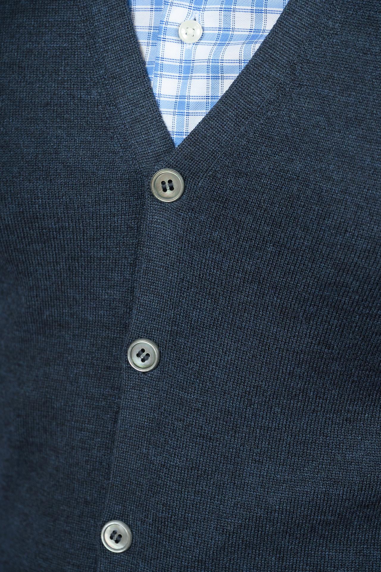 Классический дизайн с V-образным вырезом и застежкой на пуговицы делает этот шерстяной жилет универсальным выбором для различных случаев – от деловых встреч до повседневных прогулок. Тёмно-синий цвет придает образу изысканность и элегантность.