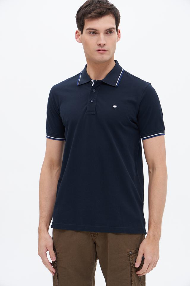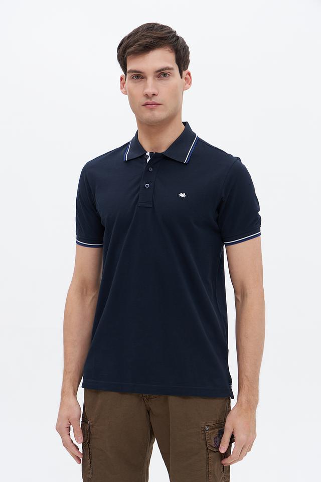 Мужское поло Granchio тёмно-синего цвета с белой полоской на воротнике и рукавах. Классический крой и 100% хлопковый состав обеспечивают комфорт и удобство в носке. Состав: хлопок 100%