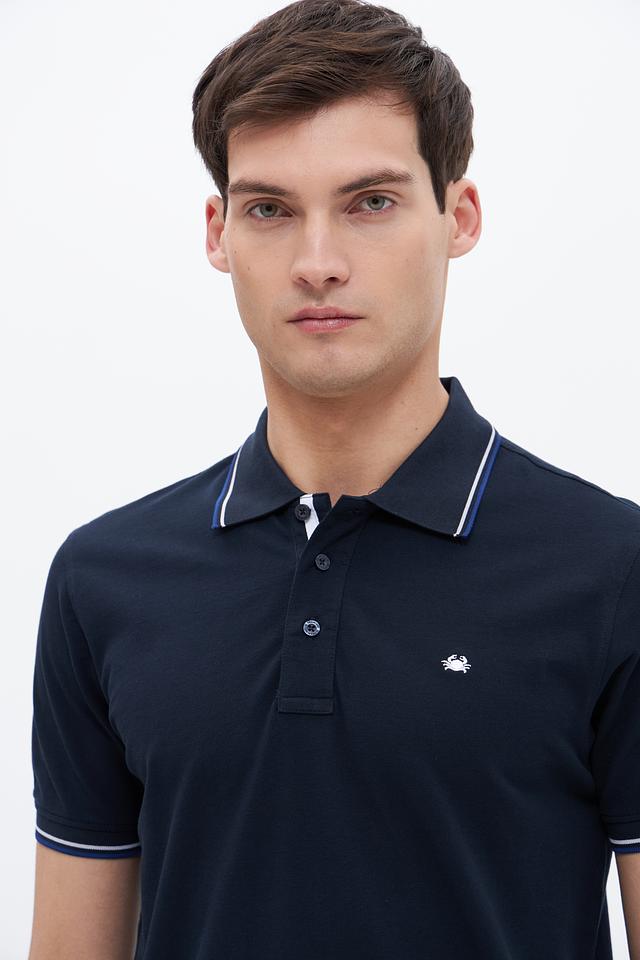Классический крой поло идеально подходит для создания как повседневных, так и более формальных образов. Тёмно-синий цвет поло дополнен контрастной белой полоской на воротнике и рукавах, что придает изделию особый шарм и элегантность.